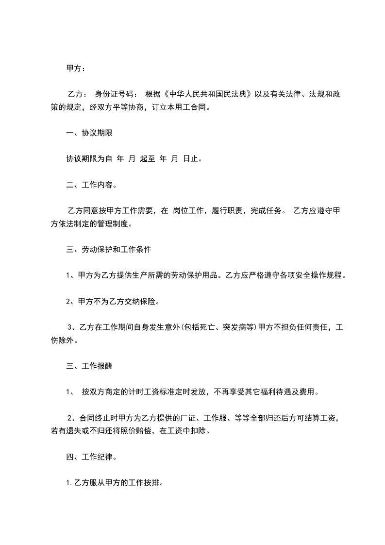 乙方: 身份证号码: 根据《中华人民共和国民法典》以及有关法律、法规和政策的规定,经双方平等协商,订立本用工合同。