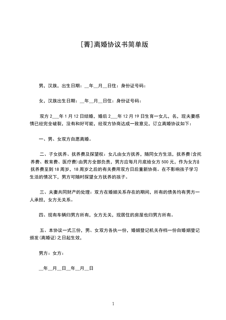 六、本协议书一式三份,男女双方各执一份,婚姻登记机关存档一份。