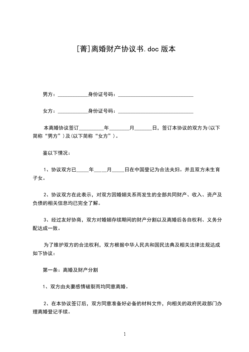 第一条:离婚及财产分割