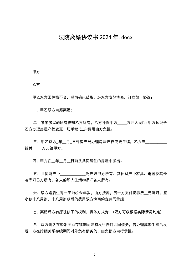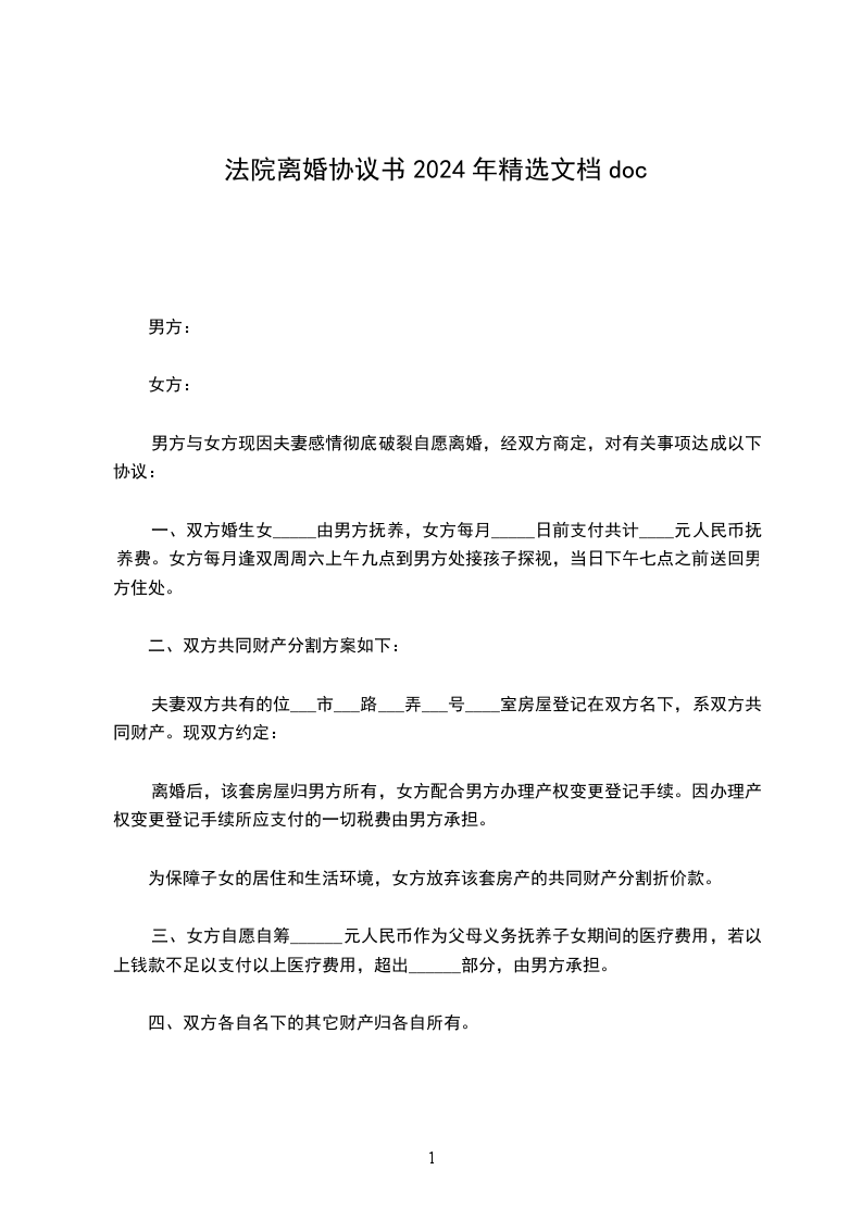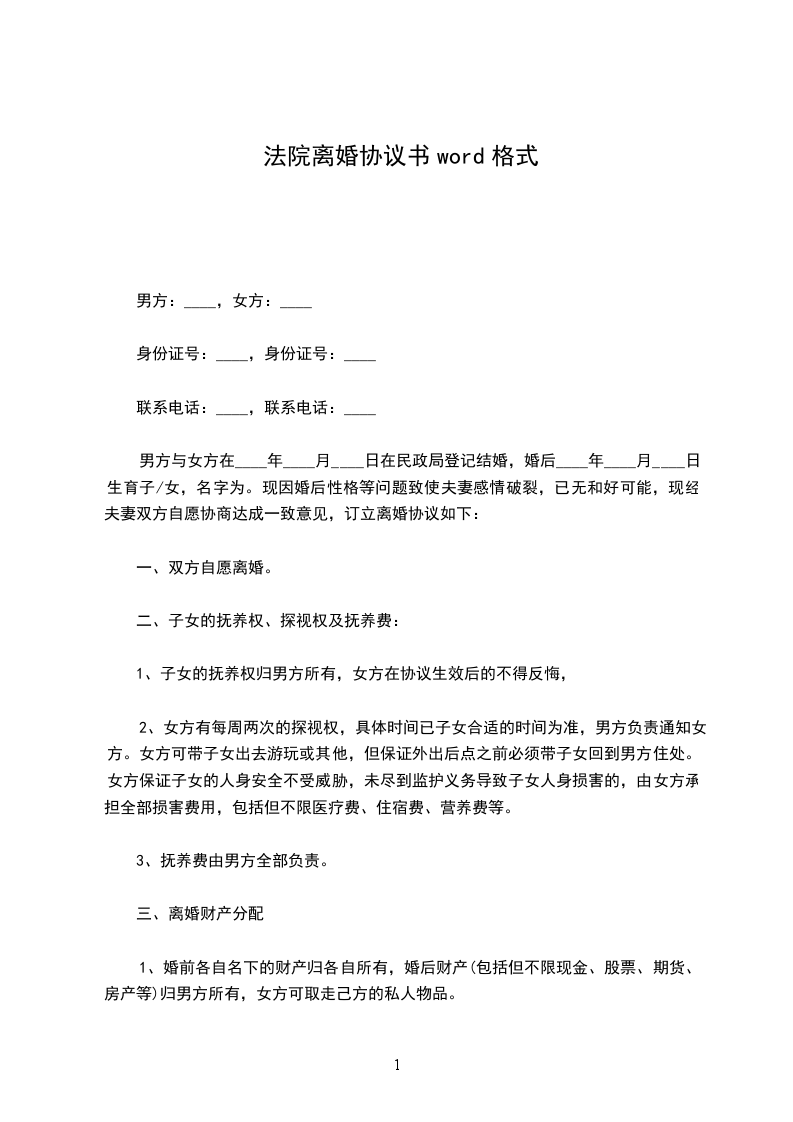 1、双方_年_月_日生育有一儿子/女儿,取名:,离婚后儿子/女儿随男方/女方直接抚养生活,由女方/男方每月给付抚养费(包括生活费、教育费、医疗费)_元,在每月_号前付清,直到孩子完成高中教育阶段止。高中教育阶段之后的有关费用双方日后重新协商。