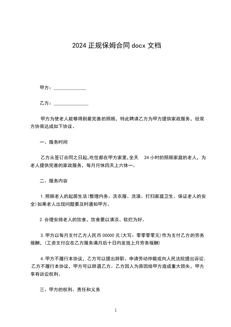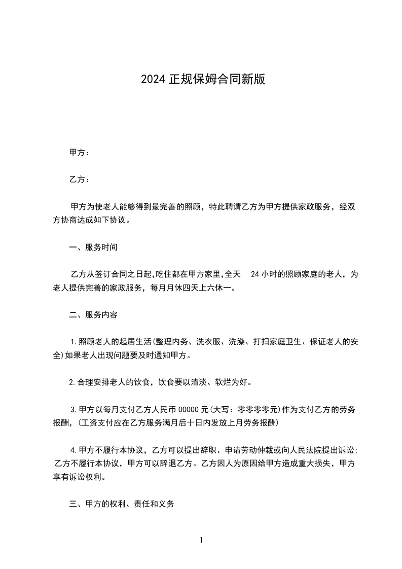 乙方从签订合同之日起,吃住都在甲方家里,全天24小时的照顾家庭的老人,为老人提供完善的家政服务,每月月休四天上六休一。