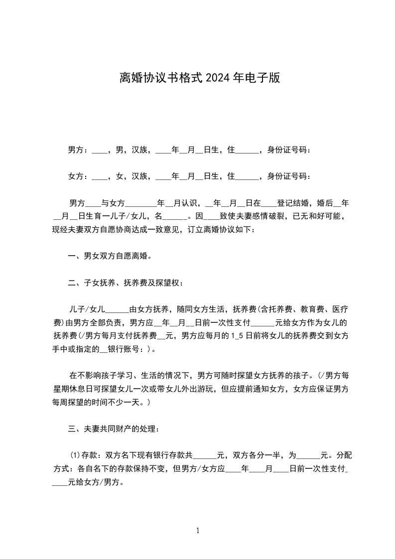 (1)存款:双方名下现有银行存款共_元,双方各分一半,为_元。分配方式:各自名下的存款保持不变,但男方应__年_月_日前一次性支付_元给女方。