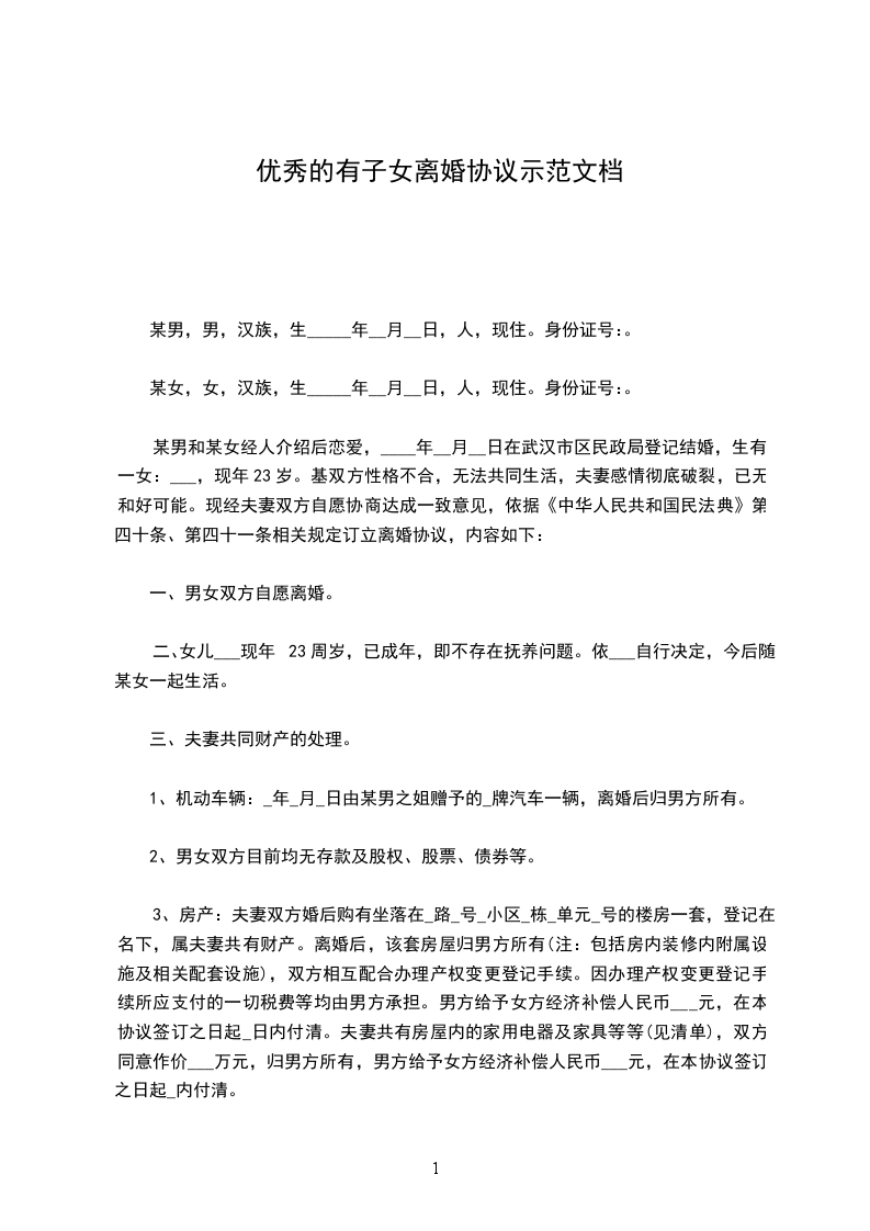 某男和某女经人介绍后恋爱,____年__月__日在武汉市区民政局登记结婚,生有一女:___,现年23岁。基双方性格不合,无法共同生活,夫妻感情彻底破裂,已无和好可能。现经夫妻双方自愿协商达成一致意见,依据《中华人民共和国民法典》第四十条、第四十一条相关规定订立离婚协议,内容如下: