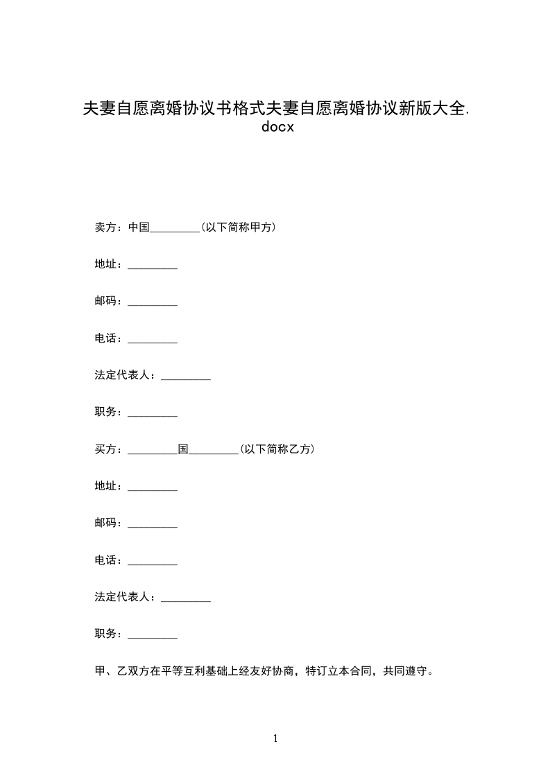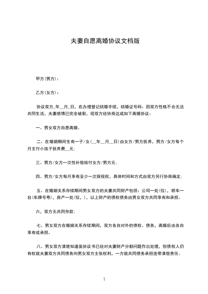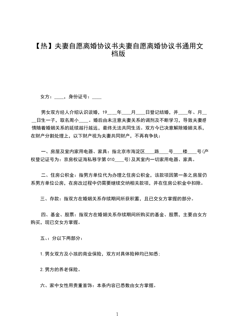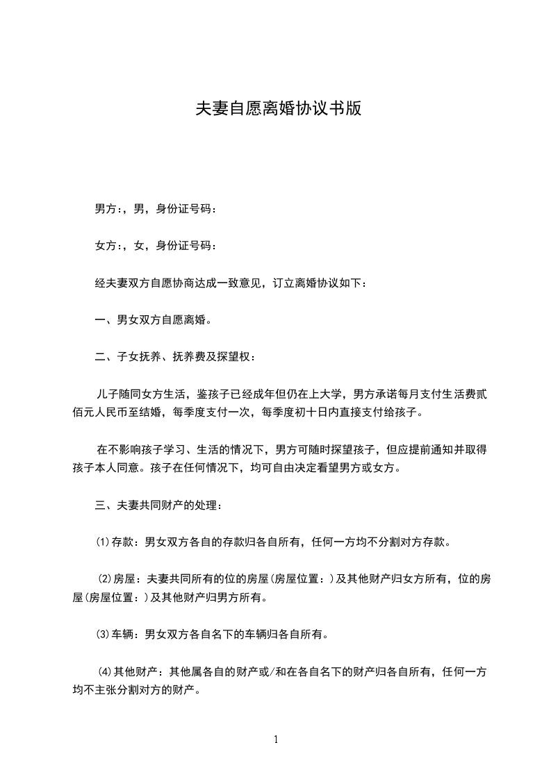 篇4自愿离婚协议书双方当事人:男方:,年龄:,民族:,职业:,身份证号码:住址:。女方:,年龄:,民族:,职业:,身份证号码:住址:。经商定,达成以下自愿离婚协议: