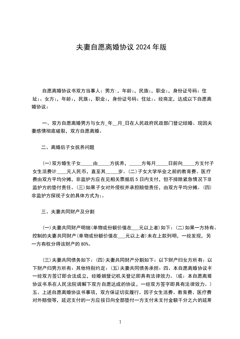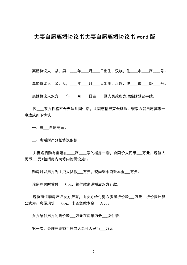 (三)夫妻共同债务如下:(四)夫妻共同财产分割如下:以下财产归女方所有:以下财产归男方所有:其他特别约定:(五)夫妻共同债务承担:四、本自愿离婚协议书一经双方签订即合法成立,经婚姻登记机关登记即具有法律效力。(或:本自愿离婚协议书系在人民法院调解下双方自愿达成的协议,一经双方签字即具有法律效力。)五、上述自愿离婚协议书事项,双方保证切实履行。因子女生活费、教育费、医疗费、对外赔偿等,延迟支付的一方应按日向全部垫付一方支付未支付金额千分之六的延期违约金。子女监护方阻止非监护方探视或不提供探视机会的,非监护方有权取得监护权,有权要求另一方支付精神损失赔偿金,精神损失赔偿金金额为监护方违约行为发生时的上年度全部收入。自愿离婚协议书当事人: