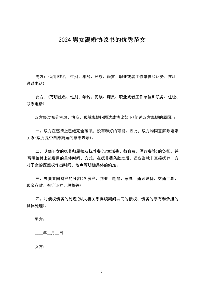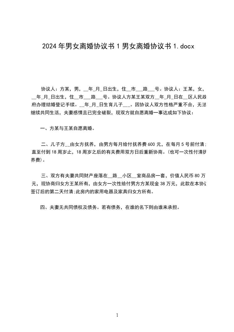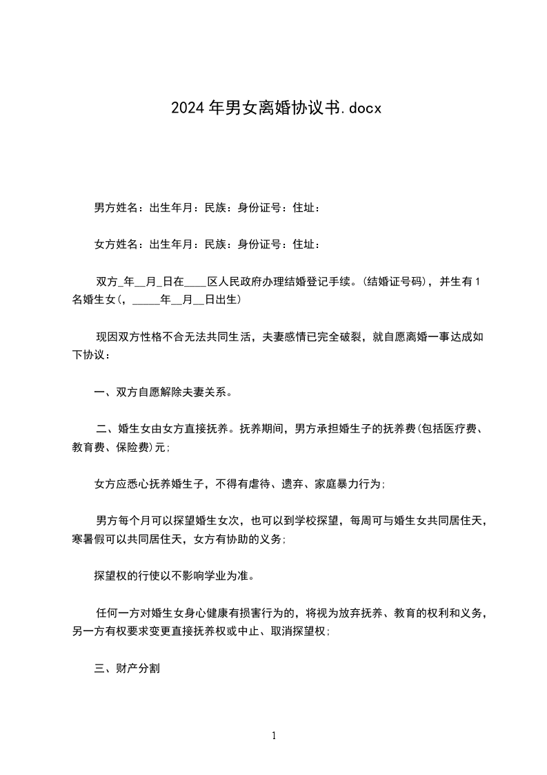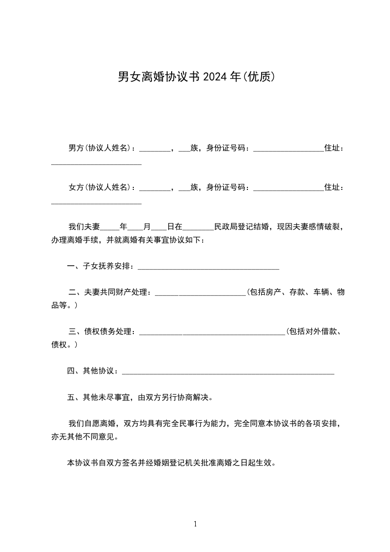 协议人双方____年____月____日在____区人民政府办理结婚登记手续。因双方性格不合无法共同生活,夫妻感情已完全破裂,现双方就自愿离婚一事达成如下协议: