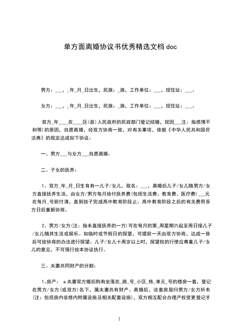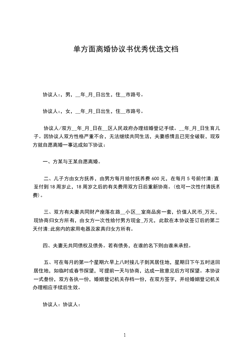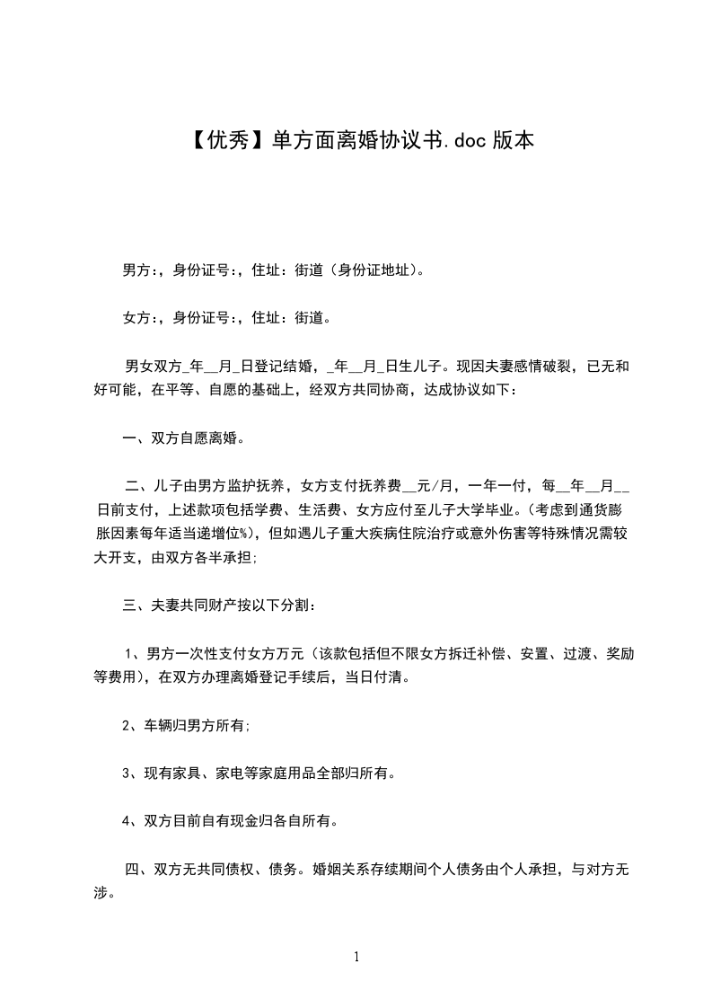 男方____与女方________年__月认识,__年__月__日在____登记结婚,婚后__年__月__日生育一儿子/女儿,名______。因____致使夫妻感情破裂,已无和好可能,现经夫妻双方自愿协商达成一致意见,订立离婚协议如下:
