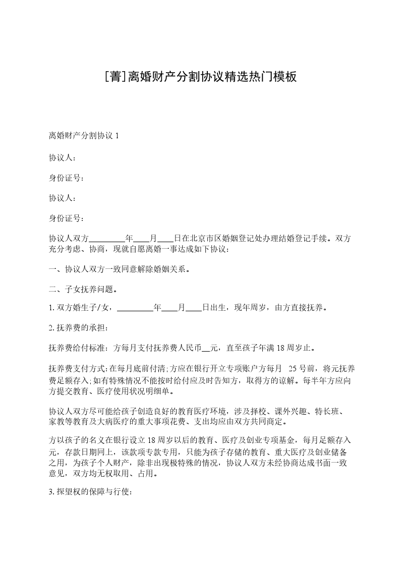 离婚财产分割协议男方:_________________,男,汉族,__________年_____月_____日生,住________________,身份证号码:_____________