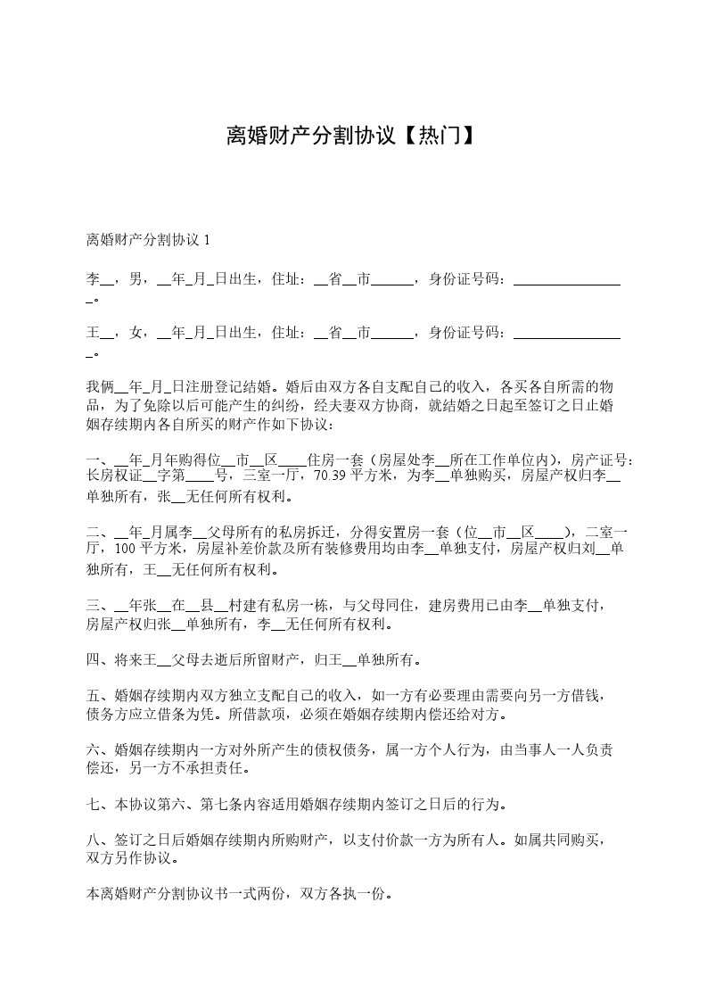 离婚财产分割协议__________,男,__________年_____月_____日出生,住址:_________________省__________市________________,身份证号码:_________________。