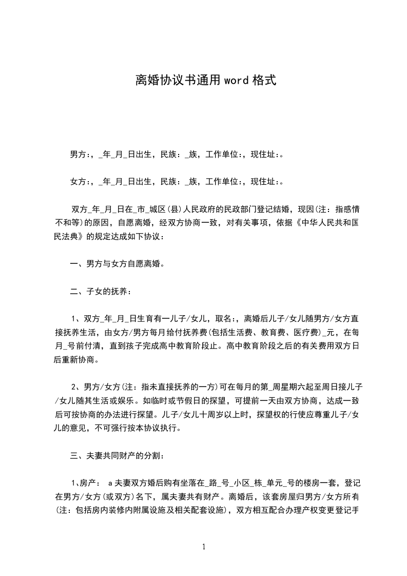 男女双方_年_月_日在__市ZZ婚姻登记机关于自愿。婚后_年_月_日生育儿(或女)。现因……(原因)导致夫妻感情破裂。现双方认真考虑,愿意通过协议离婚解除夫妻关系。经协商达成如下协议: