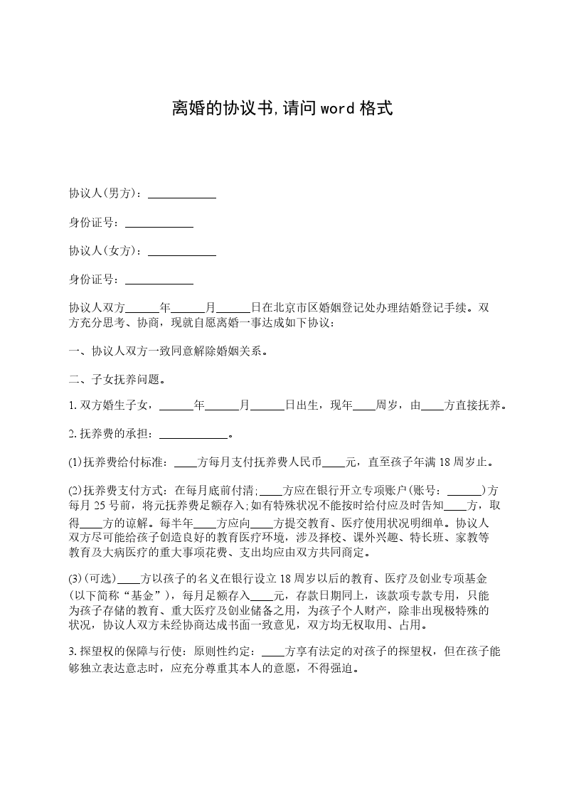 二、女方现在没有怀孕。(有怀孕的要注明怀孕多长时间,以及小朋友出生后的抚养问题。)婚生子(女)ZZZ的归男方(或者女方)。抚养费用由_方支持,每月_号前将人民币ZZZZ元转账到__银行户口(或其他支付方式及期限)。抚养费用支付到小朋友18周岁(有工作能力,读完书……情况)为止。