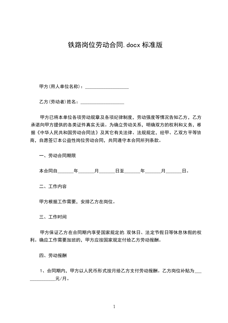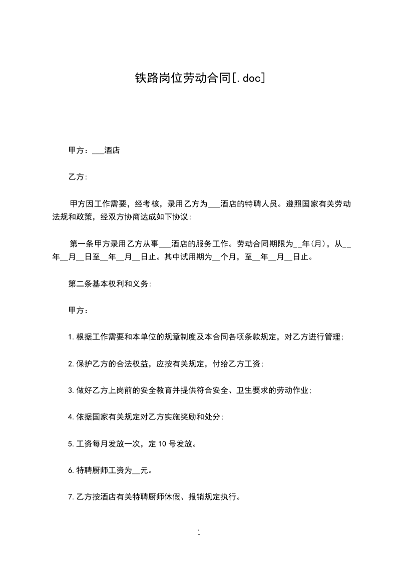 第一条甲方录用乙方从事___酒店的服务工作。劳动合同期限为__年(月),从__年__月__日至__年__月__日止。其中试用期为__个月,至__年__月__日止。