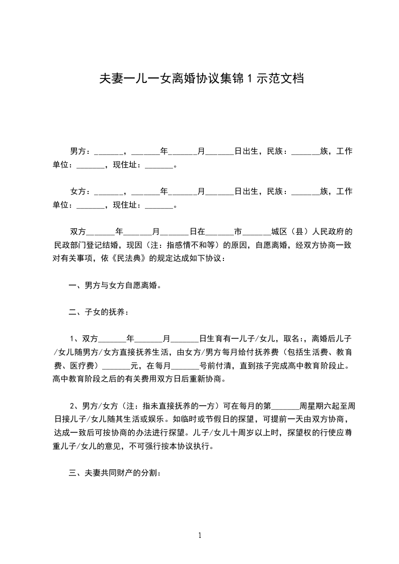 夫妻一儿一女离婚协议3甲方:________________,性别:________,________年________月________日生,________族,住址:________________,电话:________________