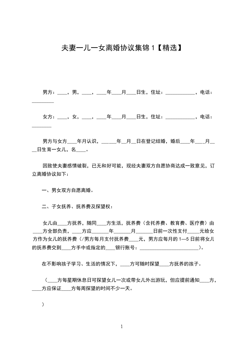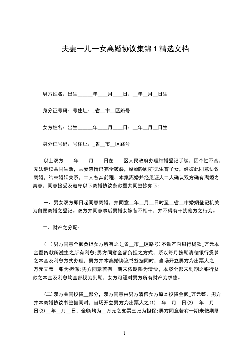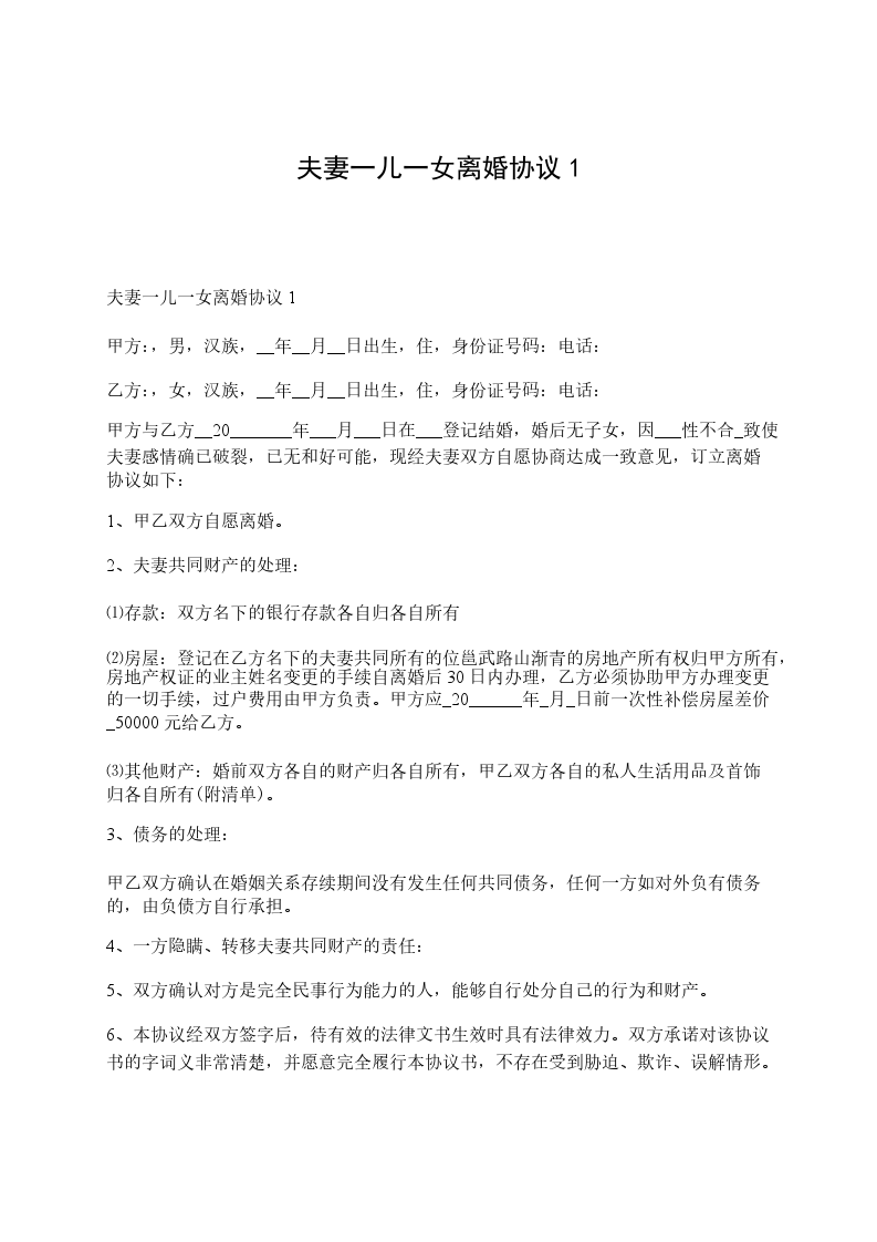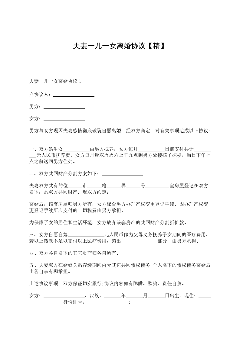 夫妻一儿一女离婚协议1