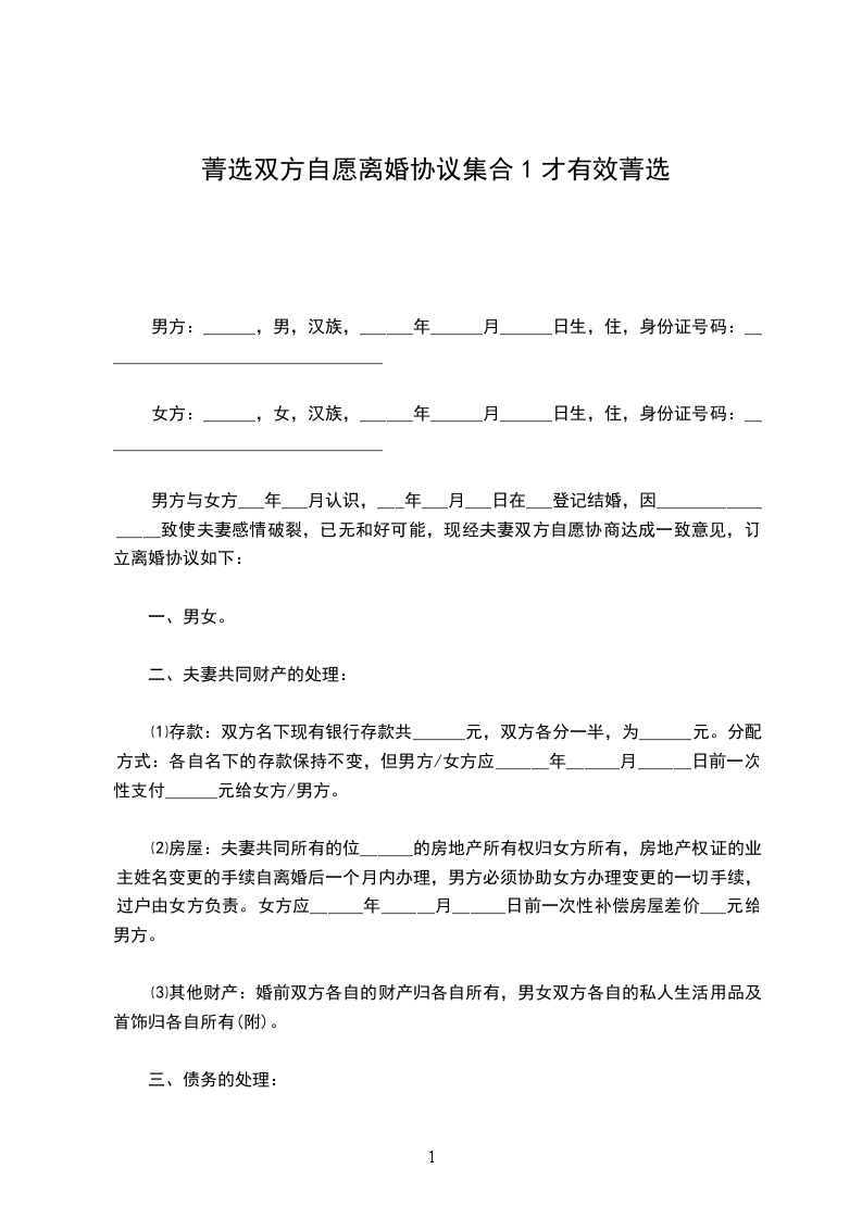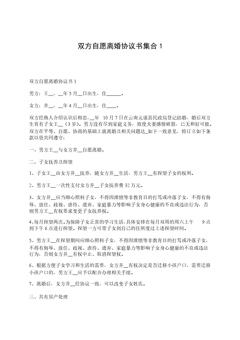 男方与女方___年___月认识,___年___月___日在___登记结婚,因_________________致使夫妻感情破裂,已无和好可能,现经夫妻双方自愿协商达成一致意见,订立离婚协议如下: