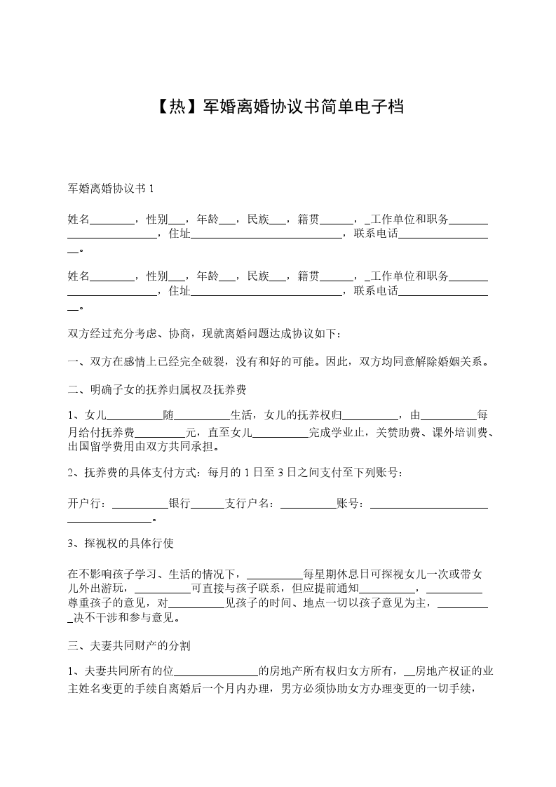 军婚离婚协议书2协议人(男方):_______________协议人(女方):_______________