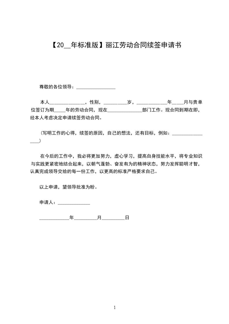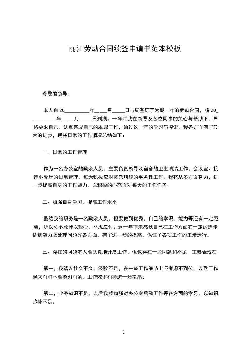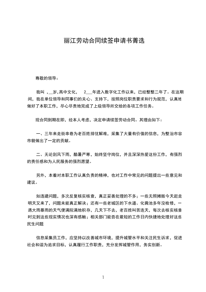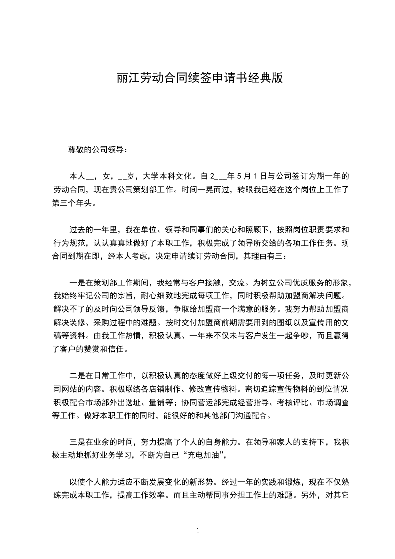本人_______________,性别,__________岁,_____________年_____月与贵单位签订为期_____年的劳动合同,现在_______________部门工作。现合同到期在即,经本人考虑决定申请续签劳动合同。