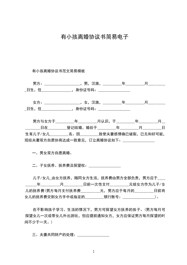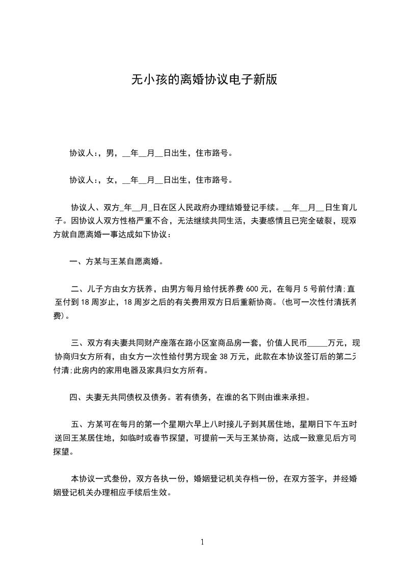 1、双方_年_月_日生育有一儿子/女儿,取名:,离婚后儿子/女儿随男方/女方直接抚养生活,由女方/男方每月给付抚养费(包括生活费、教育费、医疗费)_元,在每月_号前付清,直到孩子完成高中教育阶段止。高中教育阶段之后的有关费用双方日后重新协商。