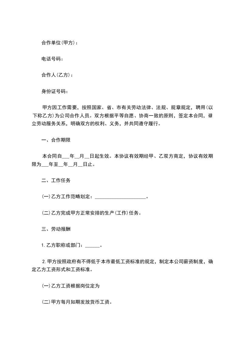 甲方因工作需要,按照国家、省、市有关劳动法律、法规、规章规定,聘用(以下称乙方)为公司合作人员。双方根据平等自愿、协商一致的原则,签定本合同,确立劳动服务关系,明确双方的权利、义务,并共同遵守履行。