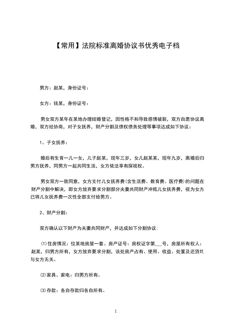 双方有夫妻共同财产座落在_路_小区_室商品房一套,价值人民币_万元,现协商归女方_所有,由女方一次性给付男方_现金_万元,此款在本协议签订后的7天内付清;此房内的家用电器及家具归女方_所有(注:家具清单可另行签订,清点好应有的家具和数量)。房地产权证的业主姓名变更的手续自离婚后一个月内办理,男方必须协助女方办理变更的一切手续,过户费用由女方负责。(注:产权手续变更的约定也很重要!)
