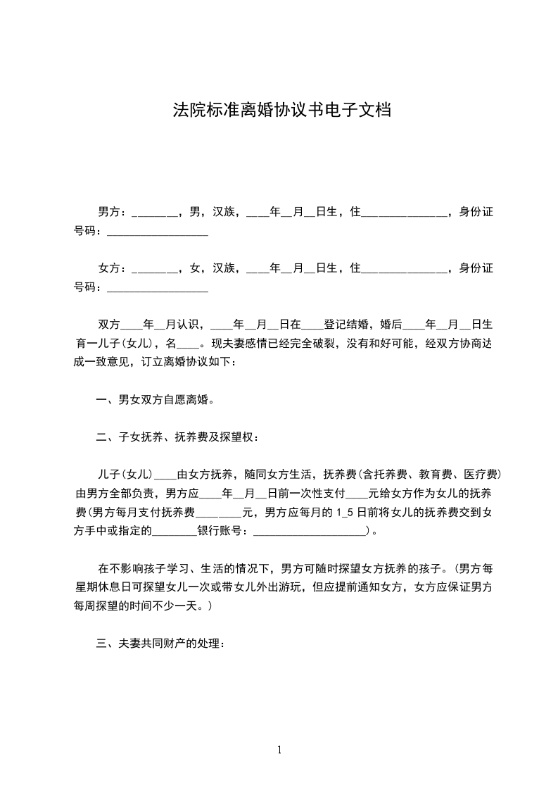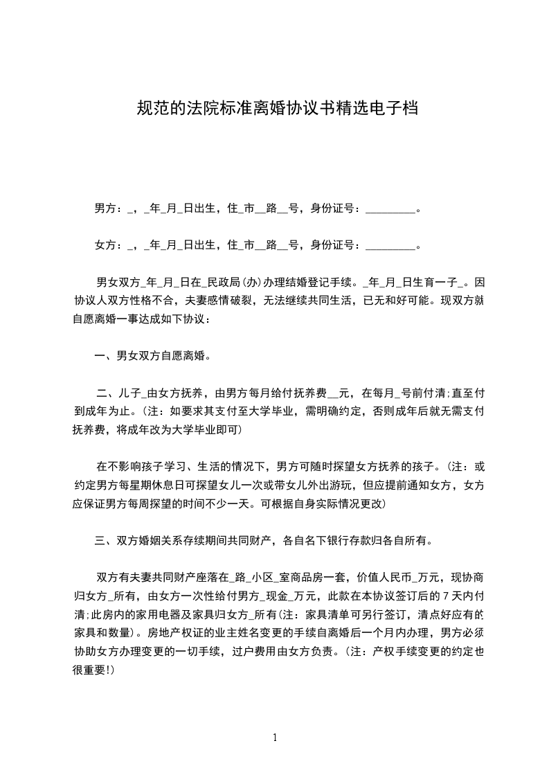 男女双方_年_月_日在_民政局(办)办理结婚登记手续。_年_月_日生育一子_。因协议人双方性格不合,夫妻感情破裂,无法继续共同生活,已无和好可能。现双方就自愿离婚一事达成如下协议: