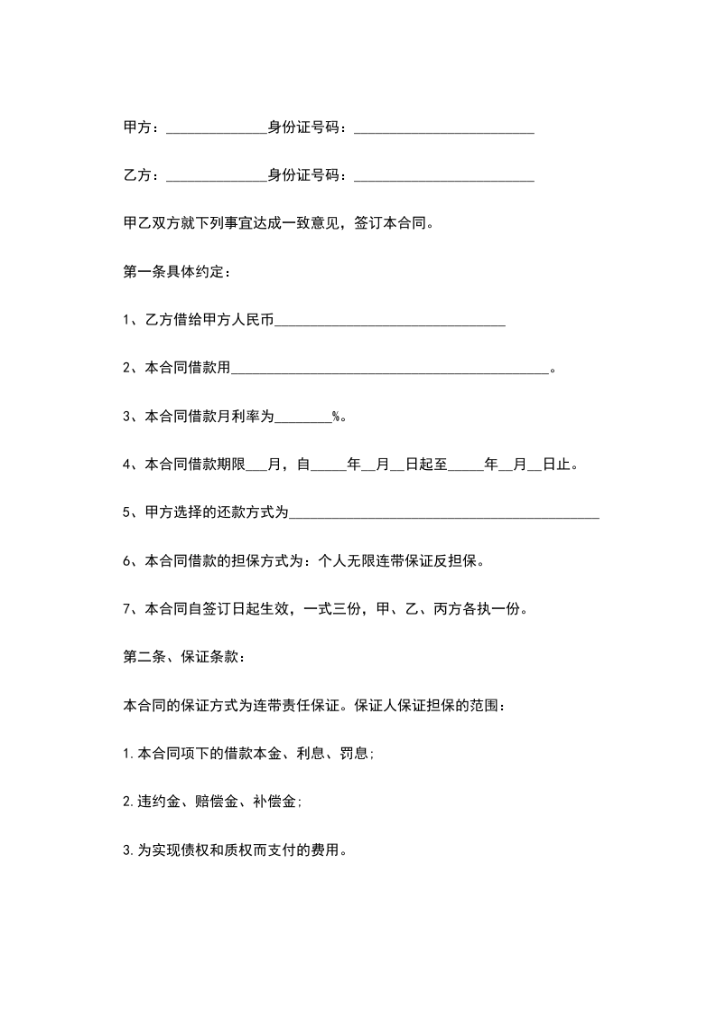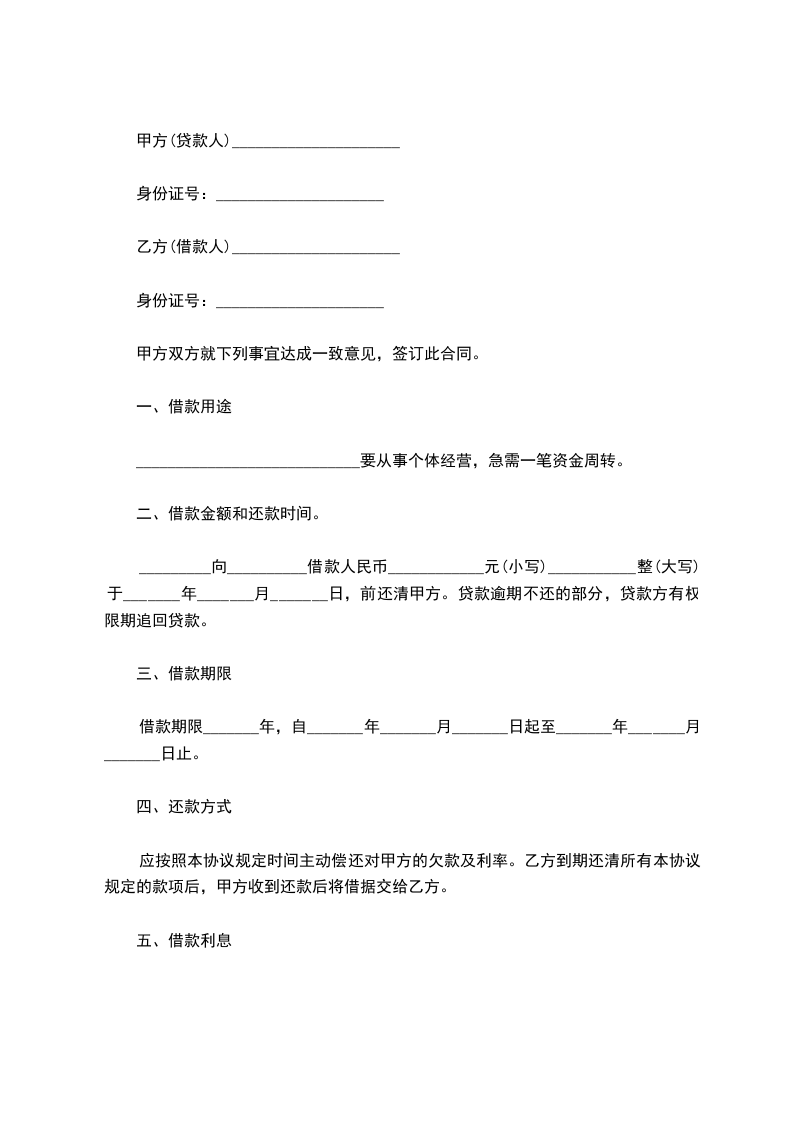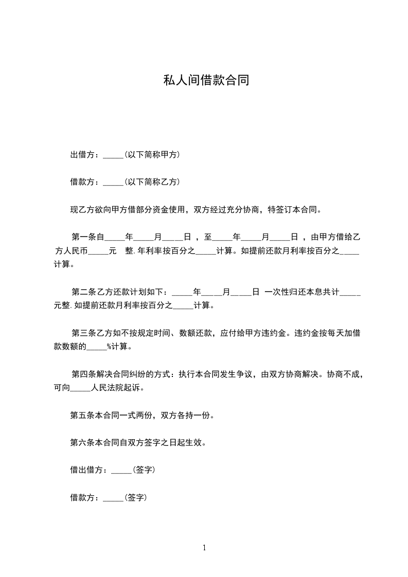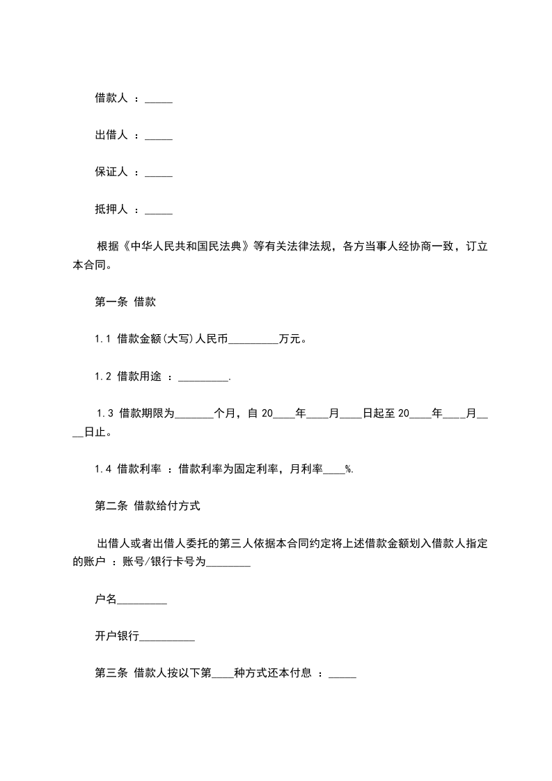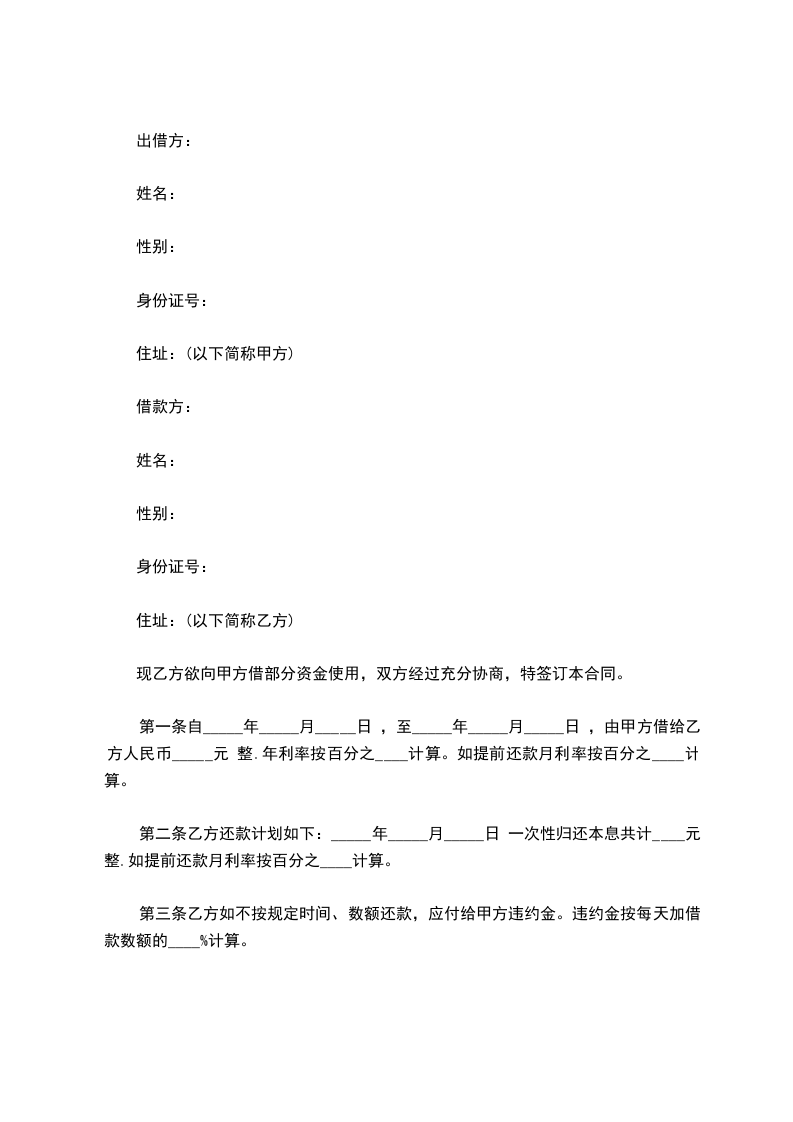 第一条自_____年_____月_____日,至_____年_____月_____日,由甲方借给乙方人民币_____元整.年利率按百分之_____计算。如提前还款月利率按百分之_____计算。