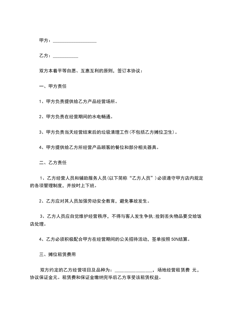 甲方同意将(以下简称该摊位)出租给乙方,经
