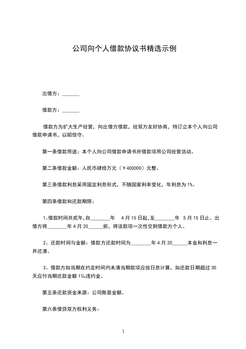 1、未经双方同意,任何一方当事人不得擅自变更或解除合同。如一方当事人要求变更或解除合同,应在__日内通知另一方当事人,并达成书面协议。本合同变更或解除后,借款方占用的借款和应付的利息仍应按本合同的规定偿付。