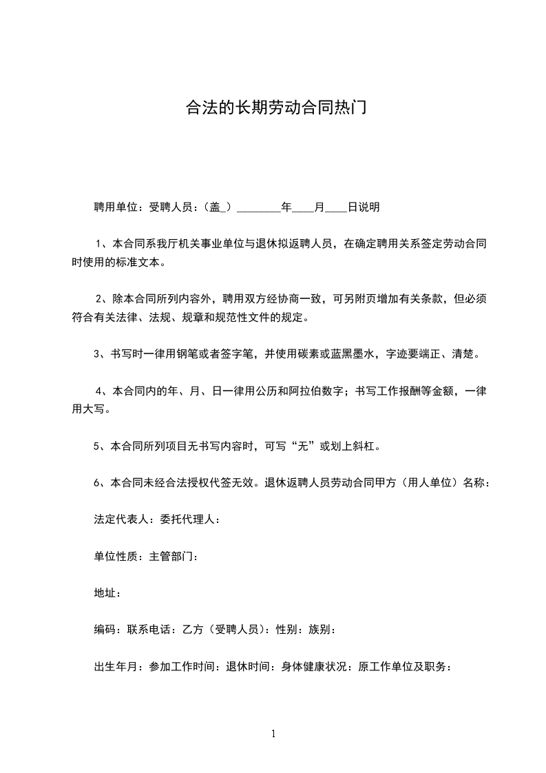 1、本合同系我厅机关事业单位与退休拟返聘人员,在确定聘用关系签定劳动合同时使用的标准文本。
