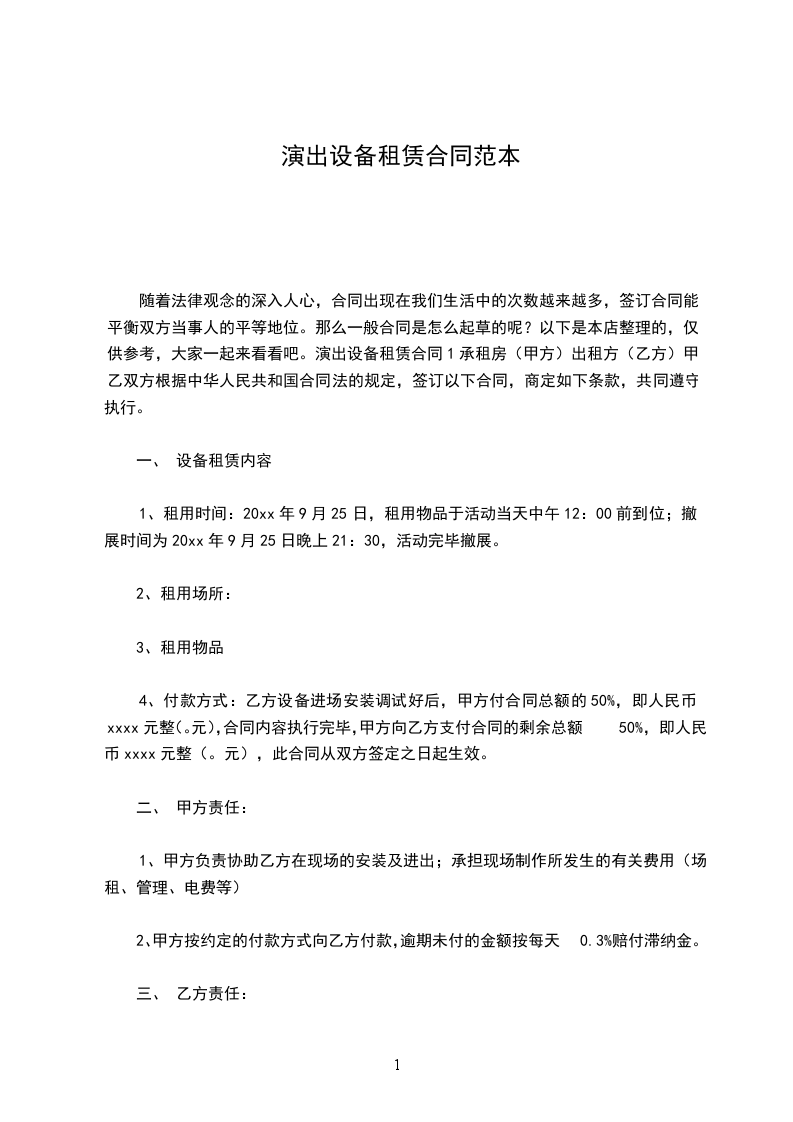 根据《中华人民共和国民法典》及相关法律、法规,甲乙双方经协商一致,就演出设备租赁事宜签订合同如下: