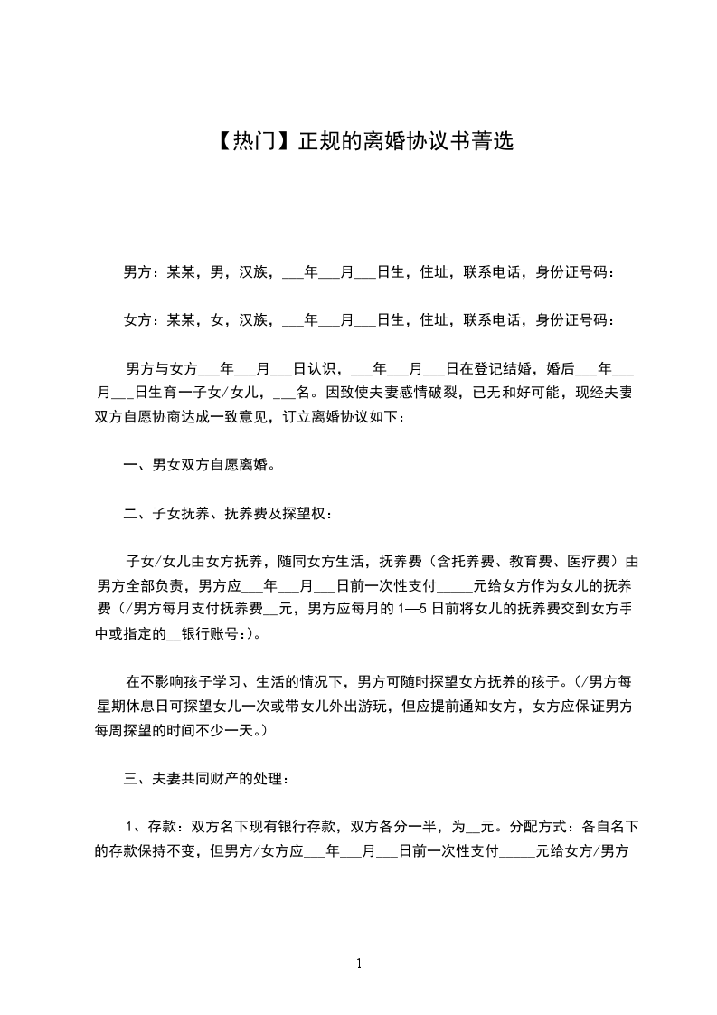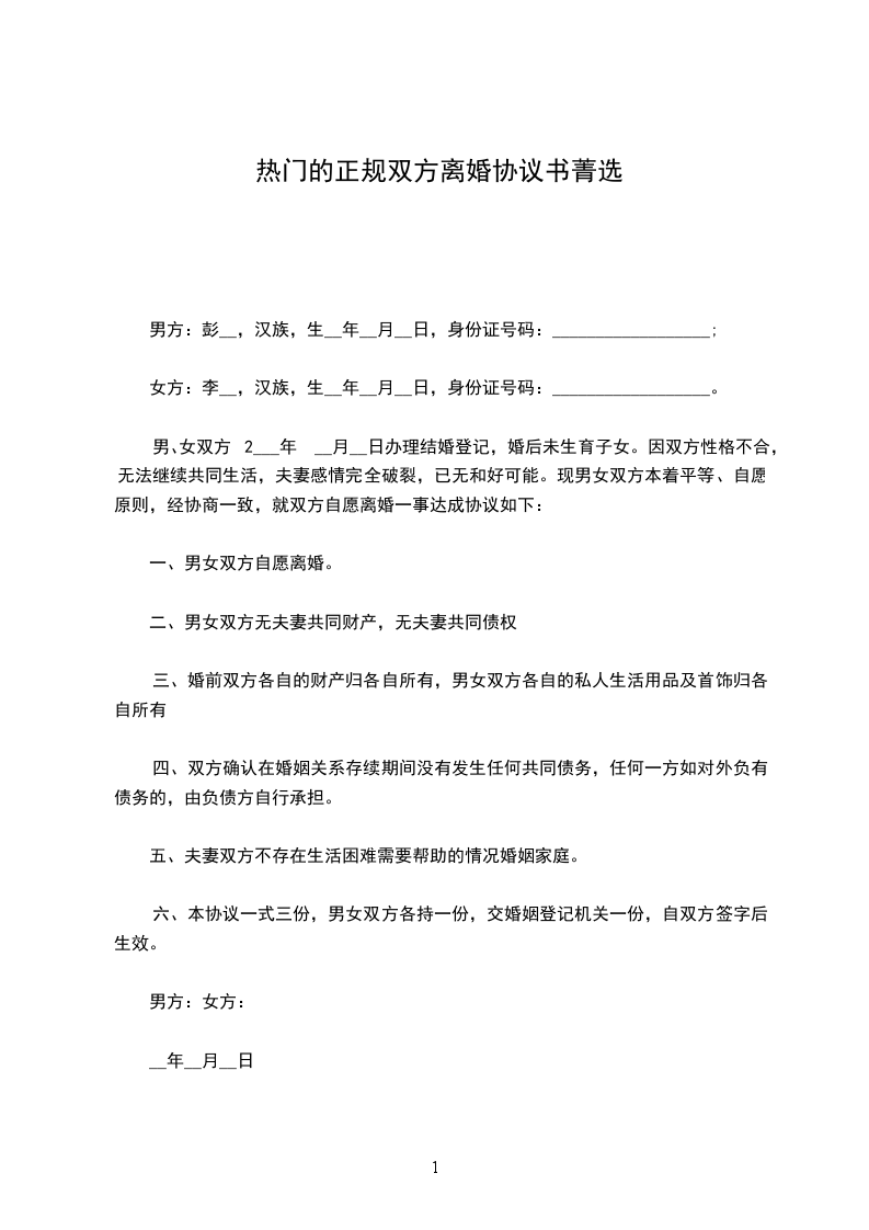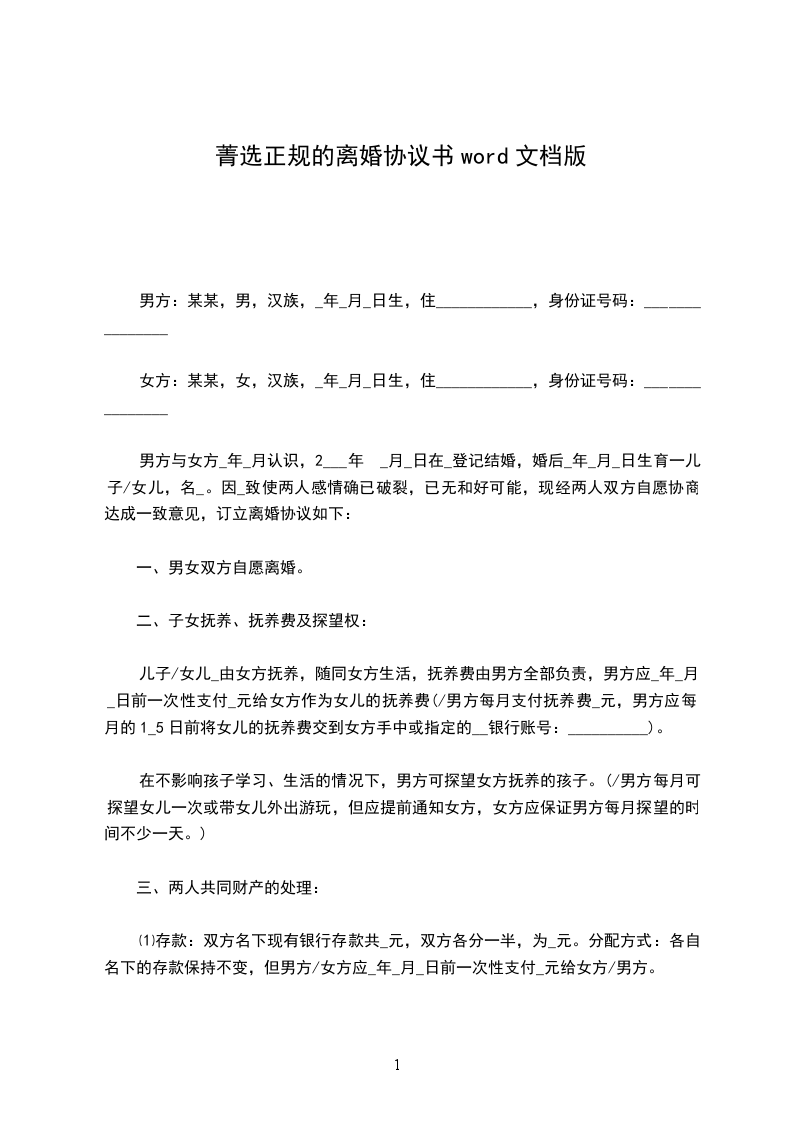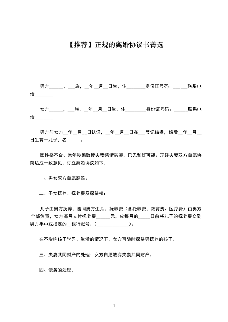 双方____年__月认识,____年__月__日在__________登记结婚,婚后____年__月__日生育一个儿子(女儿),名______。现在夫妻双方的感情已经完全破裂,已无和好可能性,经双方协商达成一致意见,订立离婚协议如下: