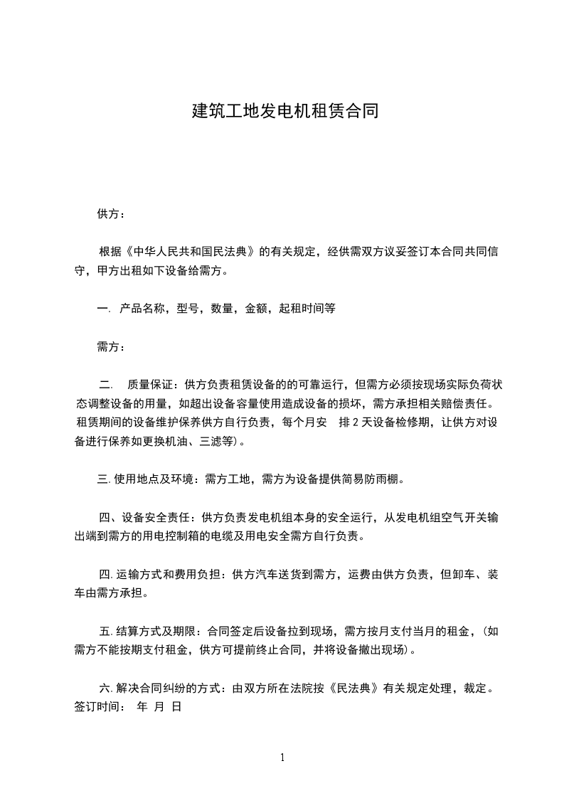 四、设备安全责任:供方负责发电机组本身的安全运行,从发电机组空气开关输出端到需方的用电控制箱的电缆及用电安全需方自行负责。