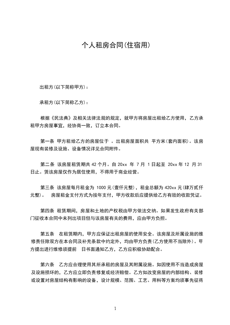 第二条 该房屋租赁期共42个月。自20xx 年 7月 1日起至 20xx年12 月31日止。赁该房屋仅作为居住使用,不得用于商业经营。