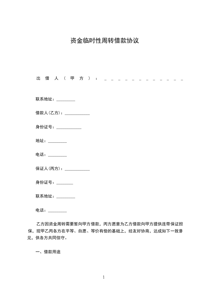甲方因生产经营项目的实施临时需要资金,乙方有闲置资金。为此,甲、乙双方根据有关法律、法规,在平等、自愿的基础上,为明确责任、恪守信用,经充分协商一致签订本借款合同,并保证共同遵守执行。