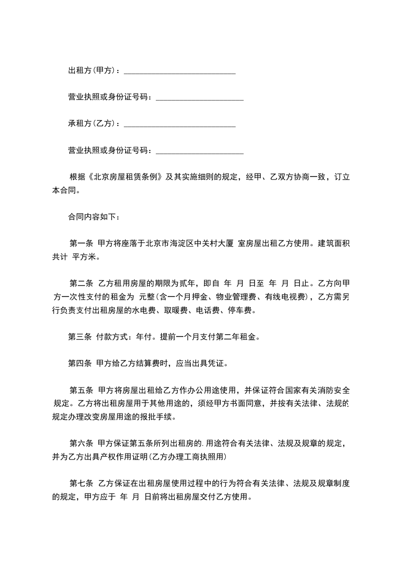 第一条 甲方将座落于北京市海淀区中关村大厦 室房屋出租乙方使用。建筑面积共计 平方米。