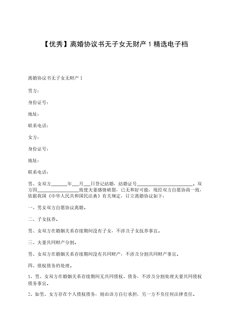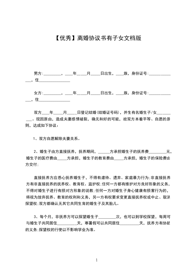 14、本协议书一式三份,甲乙双方各执一份,婚姻登记部门保留一份。