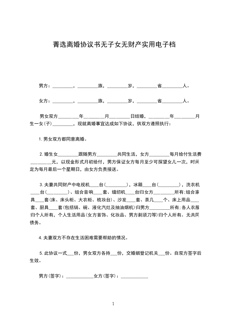男女双方_________年_________月_________日结婚,_________年_________月生一女(子)_________,现就离婚事宜达成如下协议,供双方遵照执行: