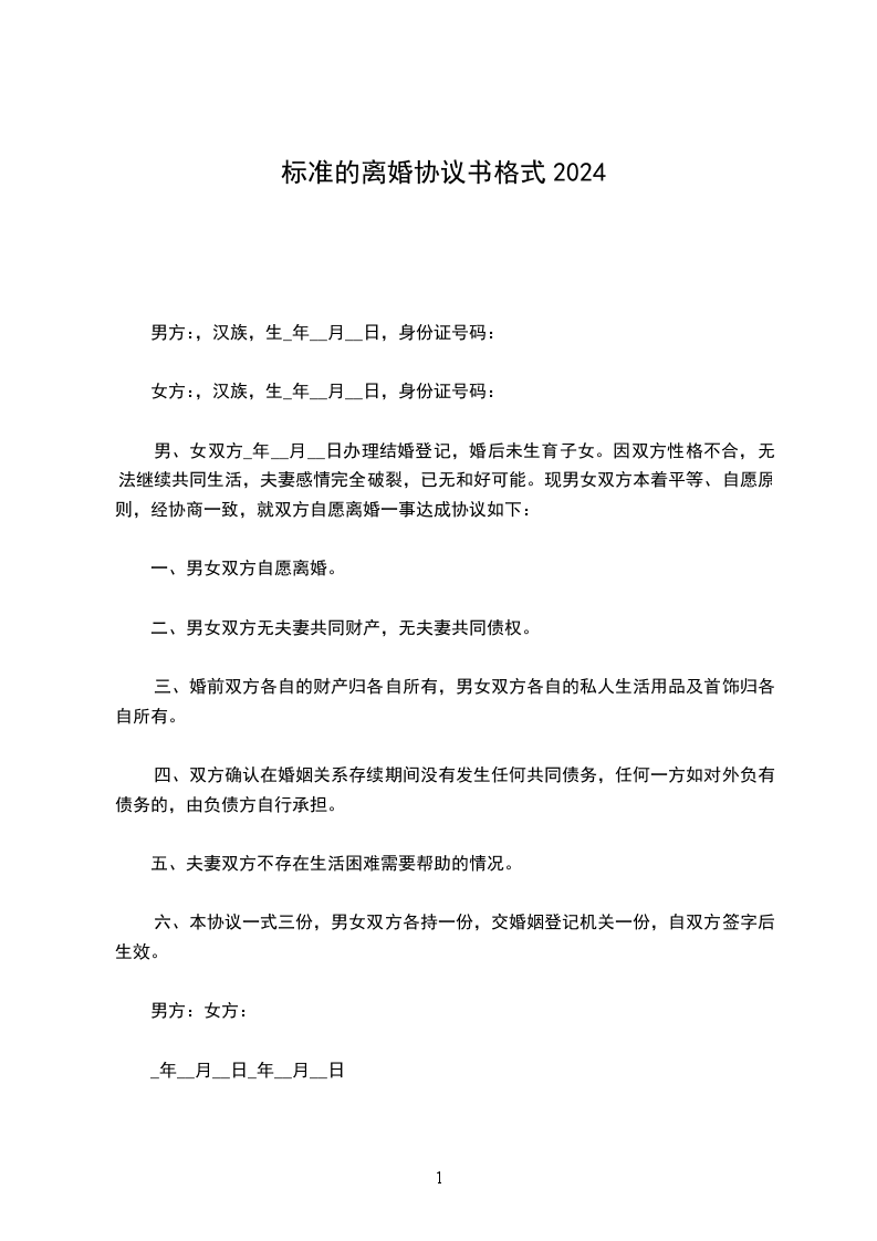 男、女双方_年__月__日办理结婚登记,婚后未生育子女。因双方性格不合,无法继续共同生活,夫妻感情完全破裂,已无和好可能。现男女双方本着平等、自愿原则,经协商一致,就双方自愿离婚一事达成协议如下: