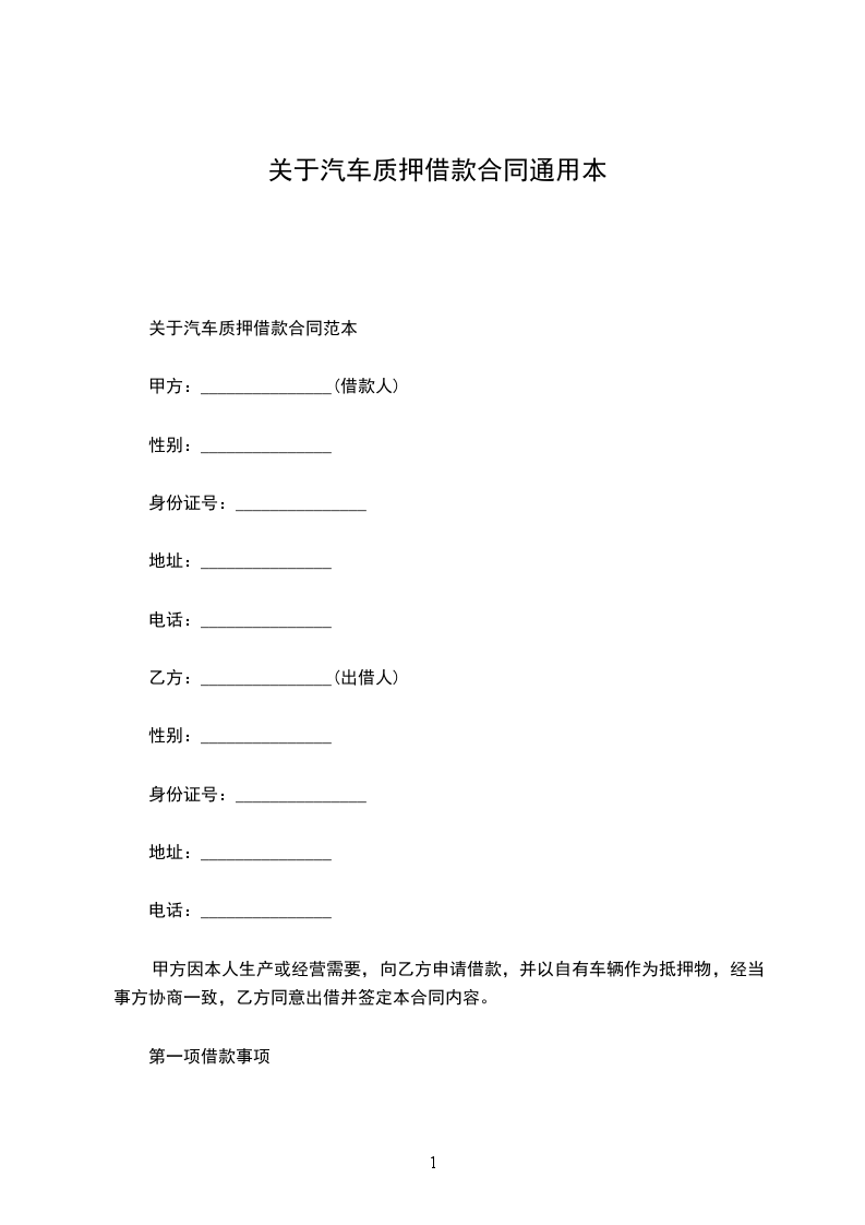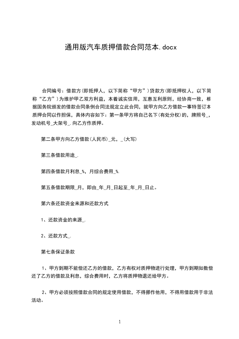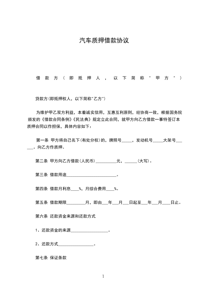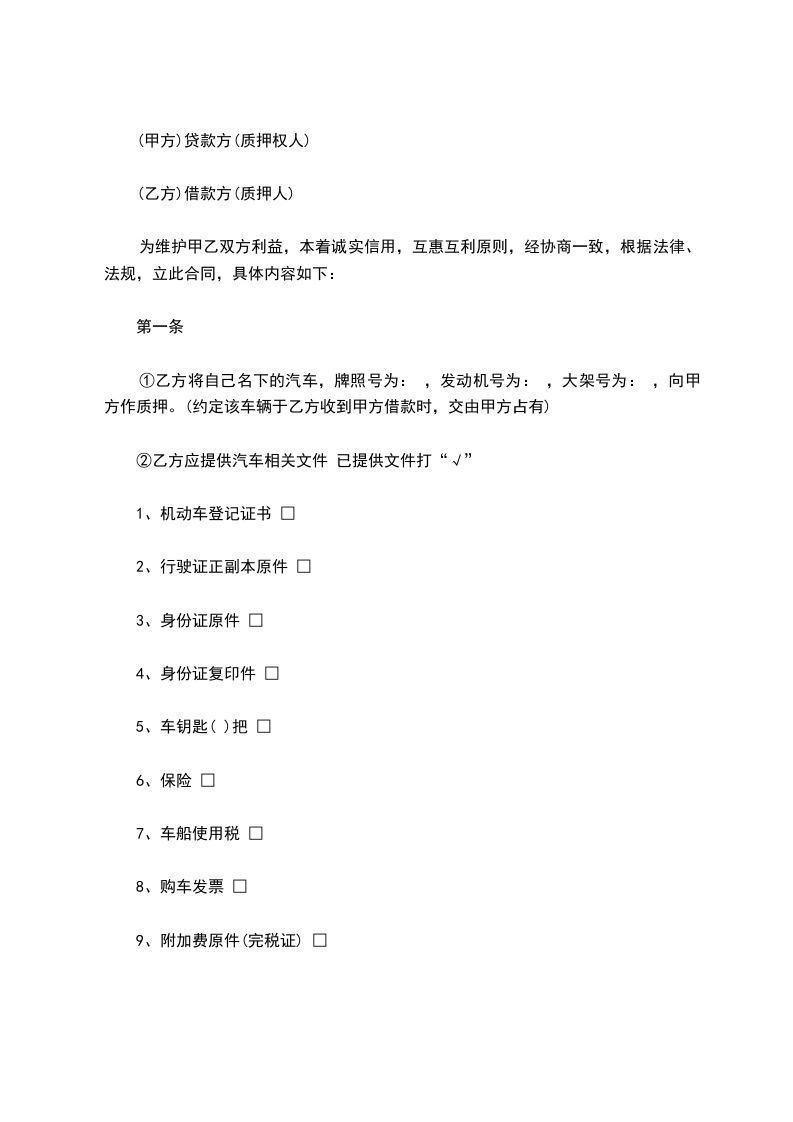 第一条甲方将自己名下(有处分权)的,牌照号_____,发动机号_____大架号______。向乙方作质押。