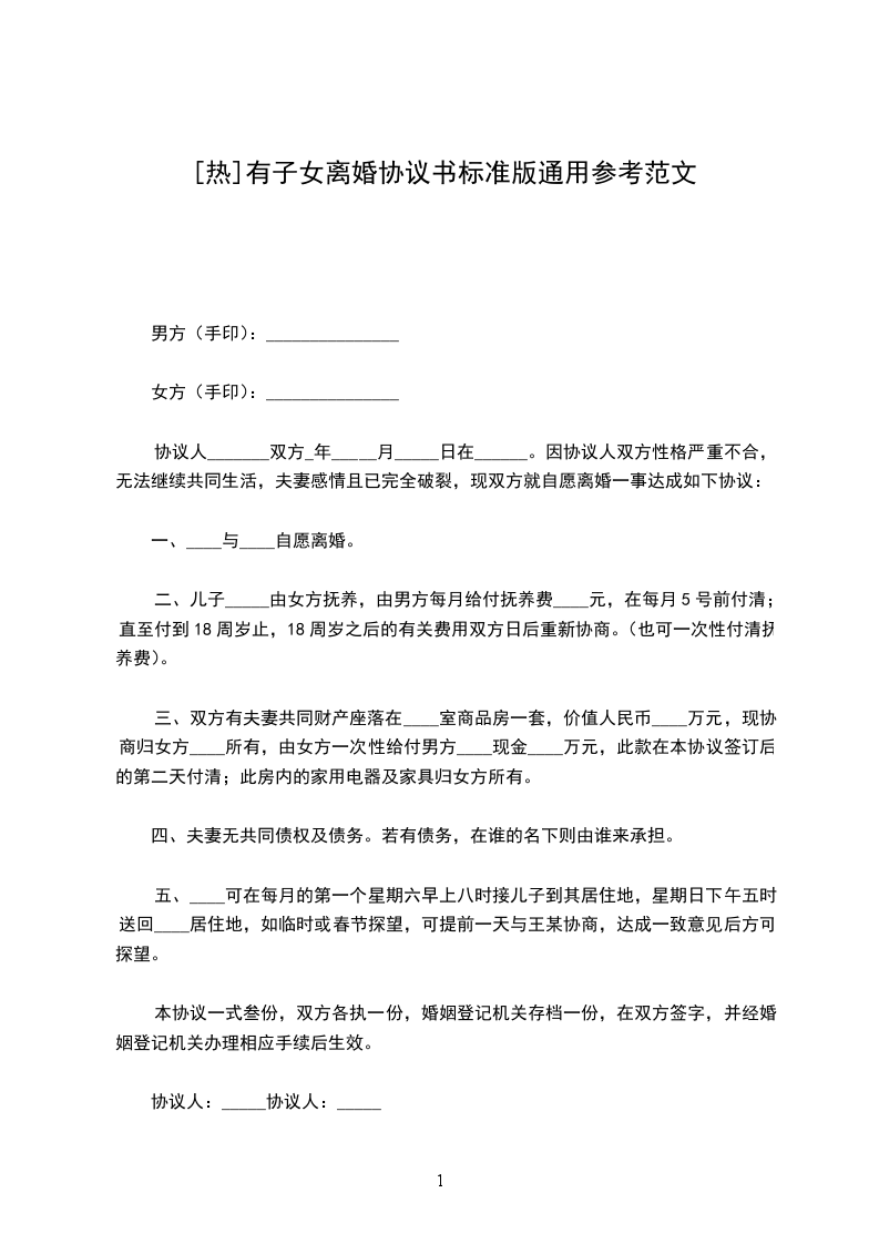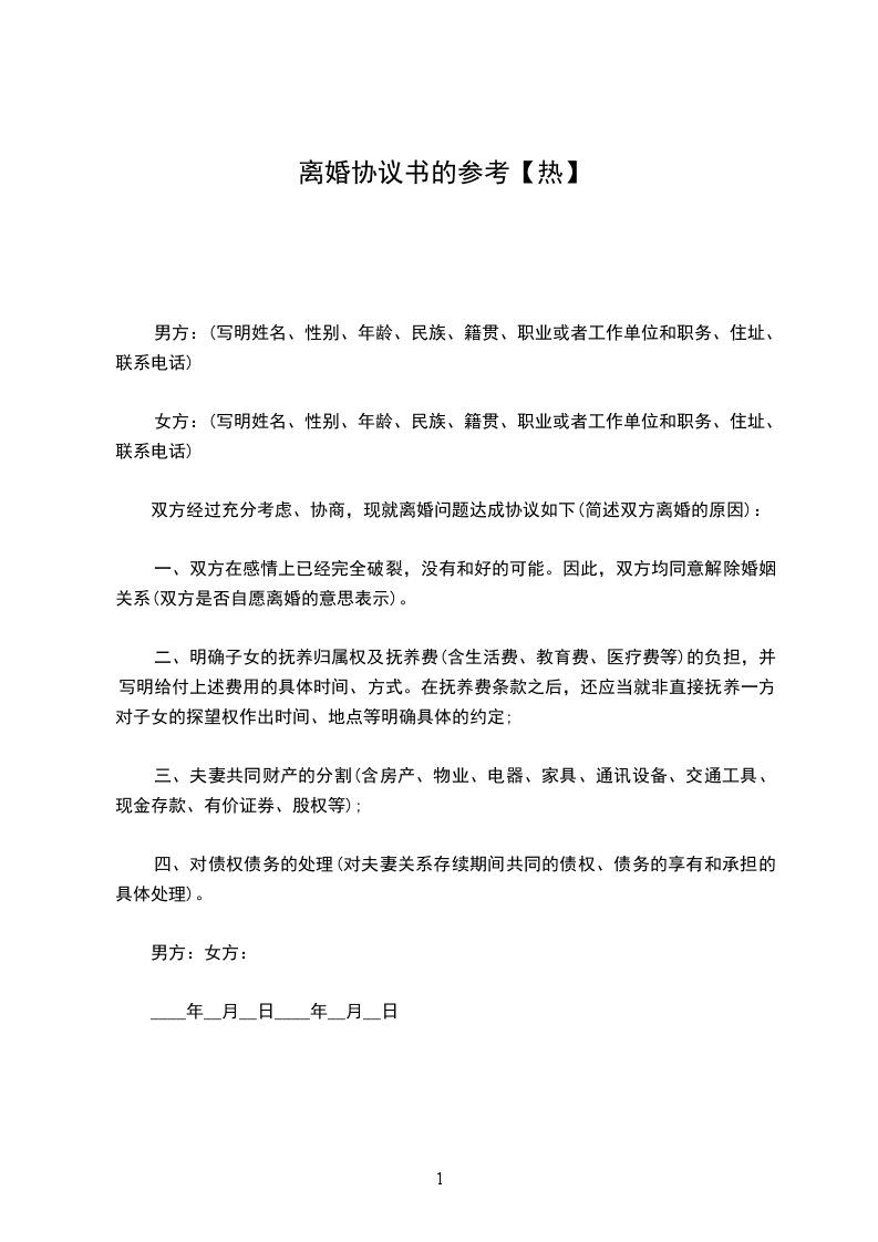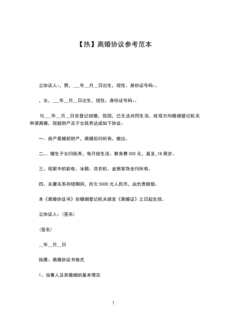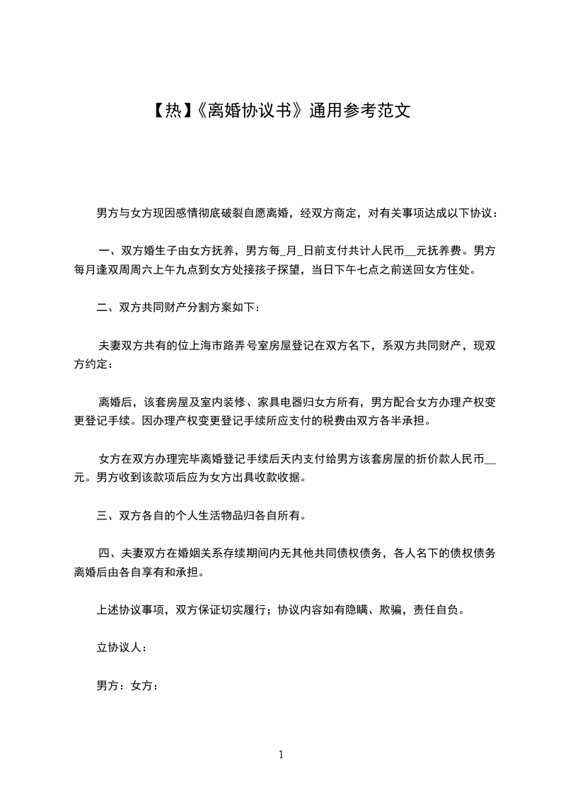 女方:李____,女,汉族,19____年___月____日生,住____市____胡同____号,身份证号码:__________________________