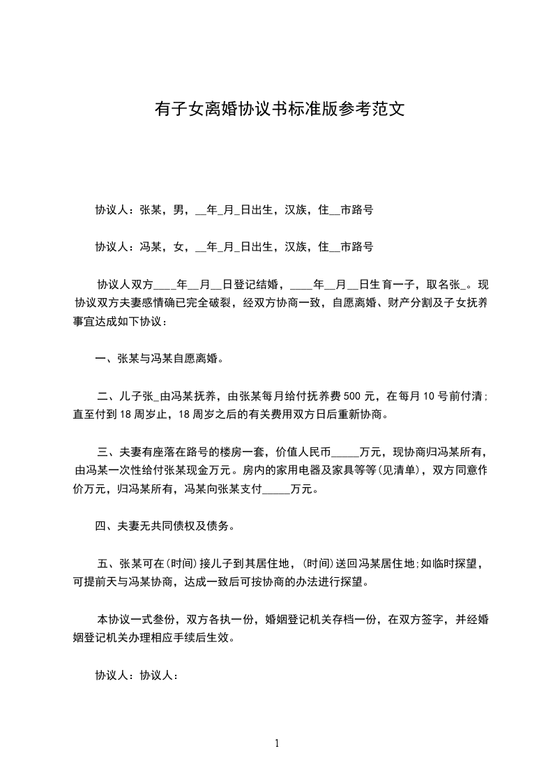 协议人双方________年____月____日登记结婚,________年____月____日生育一子,取名。现协议双方夫妻感情确已完全破裂,经双方协商一致,自愿离婚、财产分割及子女抚养事宜达成如下协议: