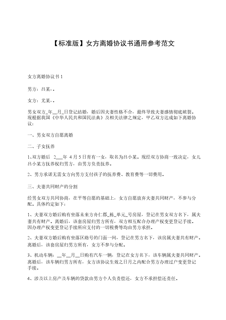 女方离婚协议书男方:______,男,汉族,____年__月__日生,住______,身份证号码:____________
