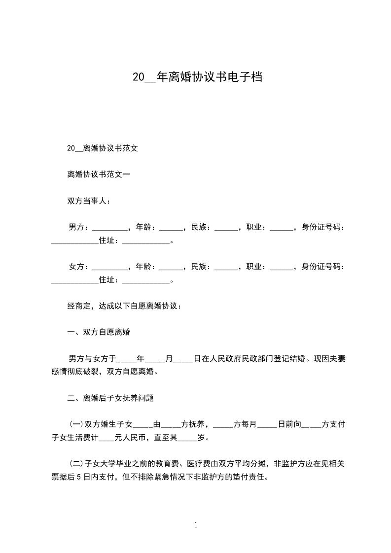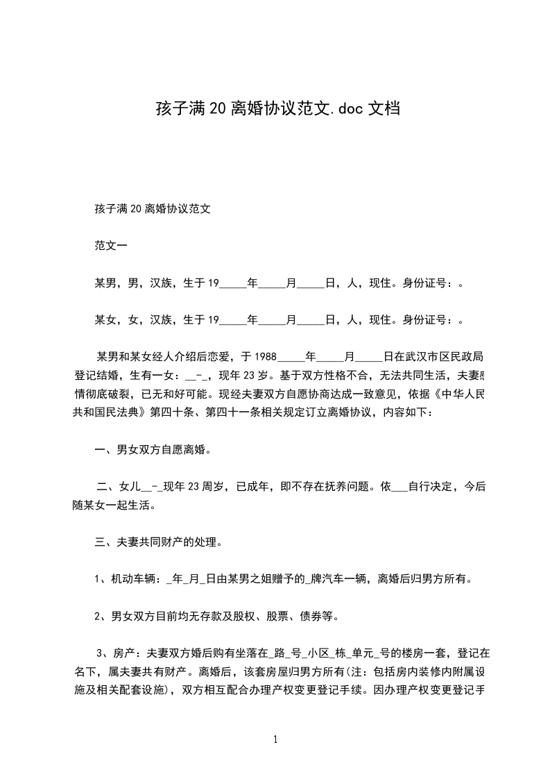 两方____年__月认识,____年__月__日在__________登记结婚,婚后____年__月__日生育一个儿子(女儿),名______。现夫妻感情已经完全破裂,没有和好可能,经两方协商达成一致意见,订立如下: