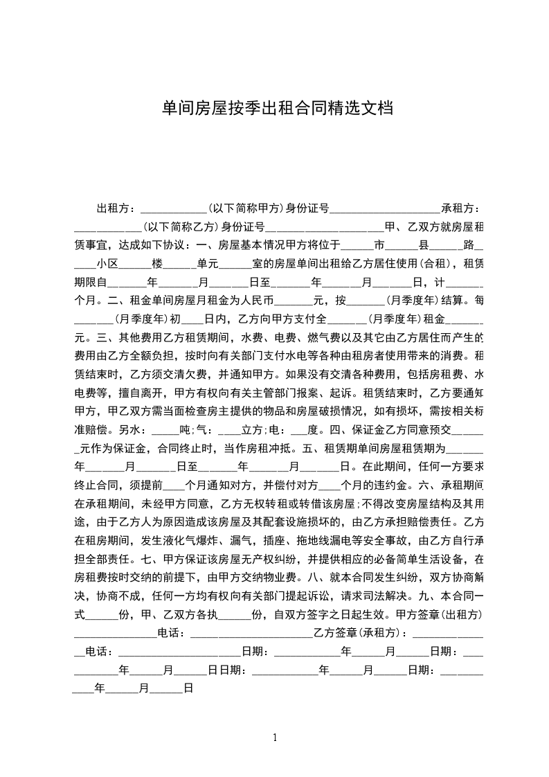 单间房屋租赁期为_______年_______月_______日至_______年_______月_______日。在此期间,任何一方要求终止合同,须提前____个月通知对方,并偿付对方____个月的违约金。