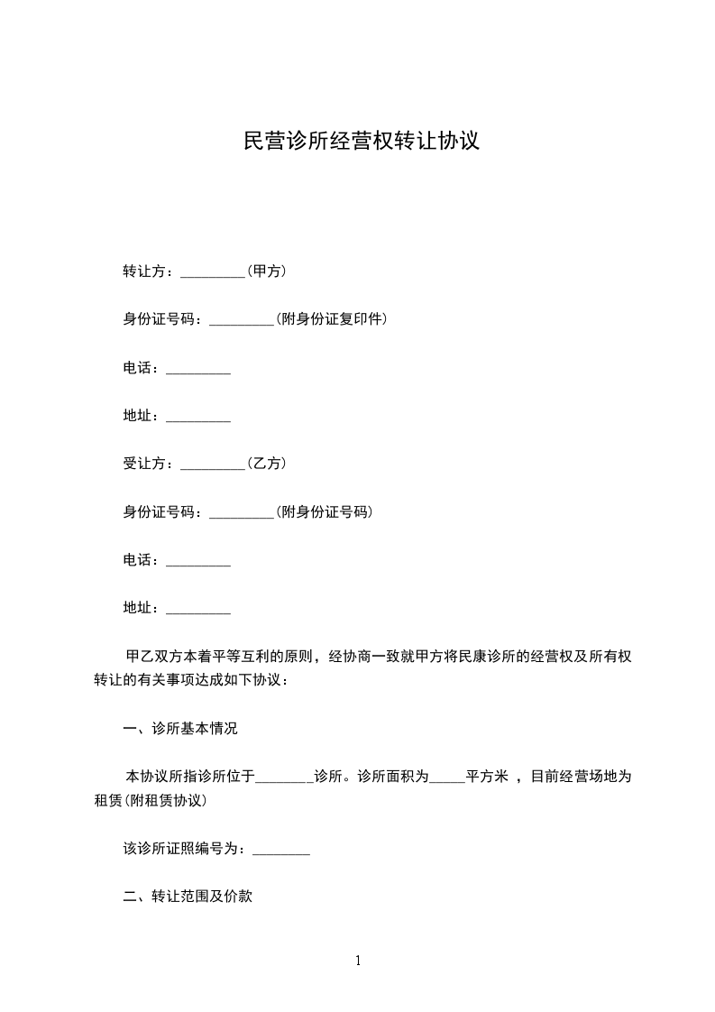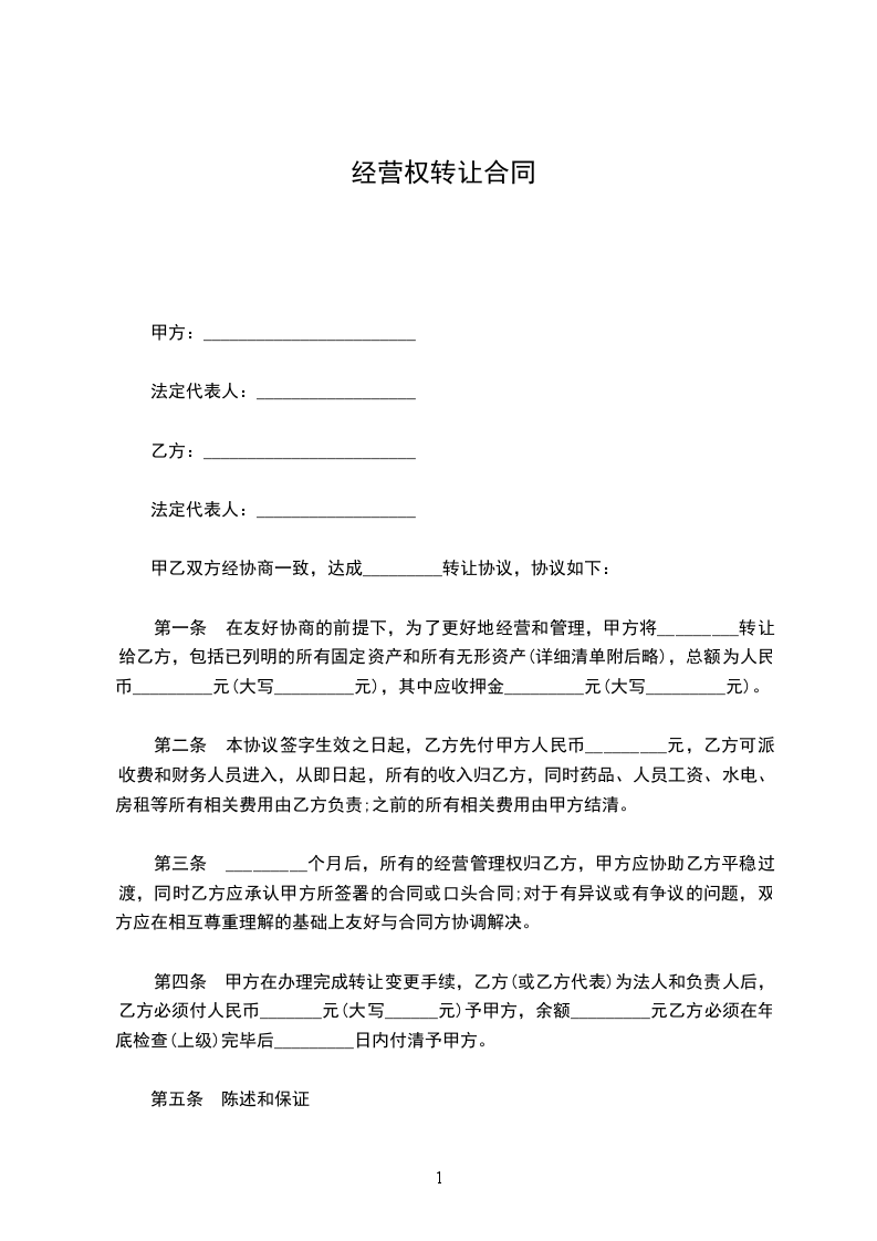 第一条 在友好协商的前提下,为了更好地经营和管理,甲方将_________转让给乙方,包括已列明的所有固定资产和所有无形资产(详细清单附后略),总额为人民币_________元(大写_________元),其中应收押金_________元(大写_________元)。
