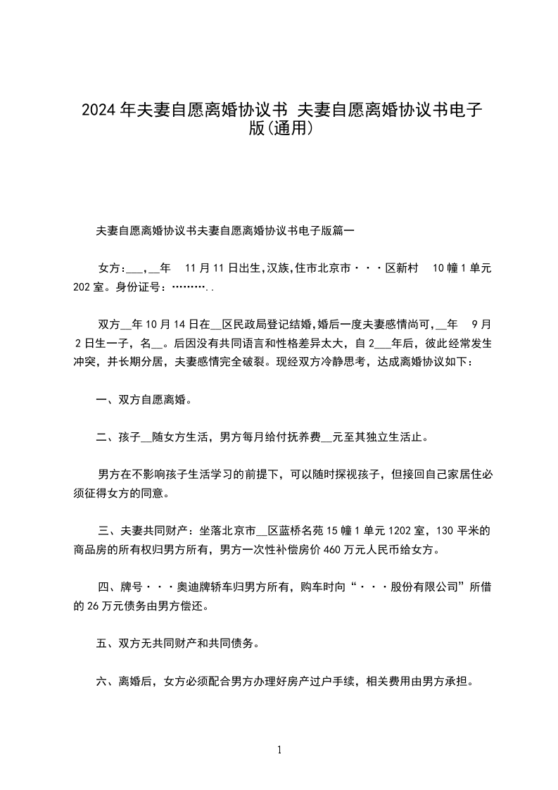 本协议一式________份,自婚姻登记机颁发《离婚证》之日起生效,男、女双方各执一份,婚姻登记机关存档一份。