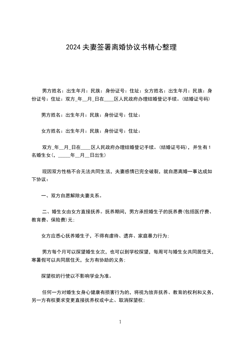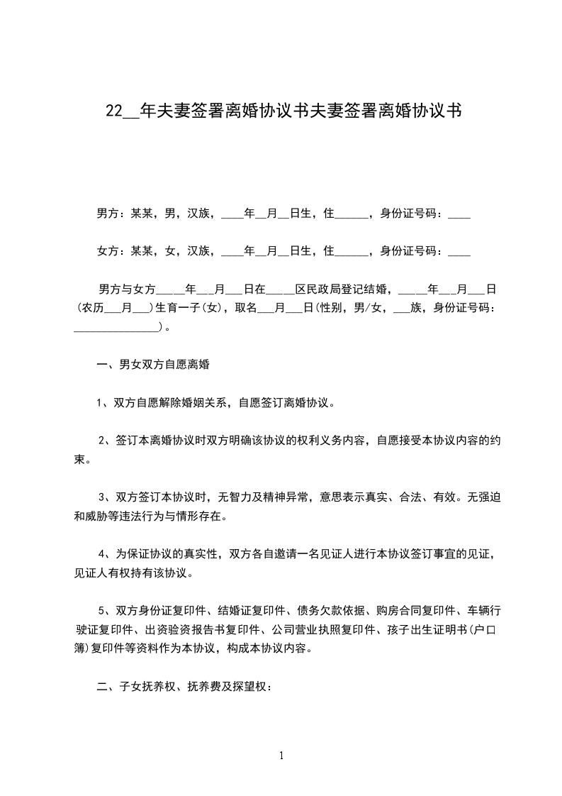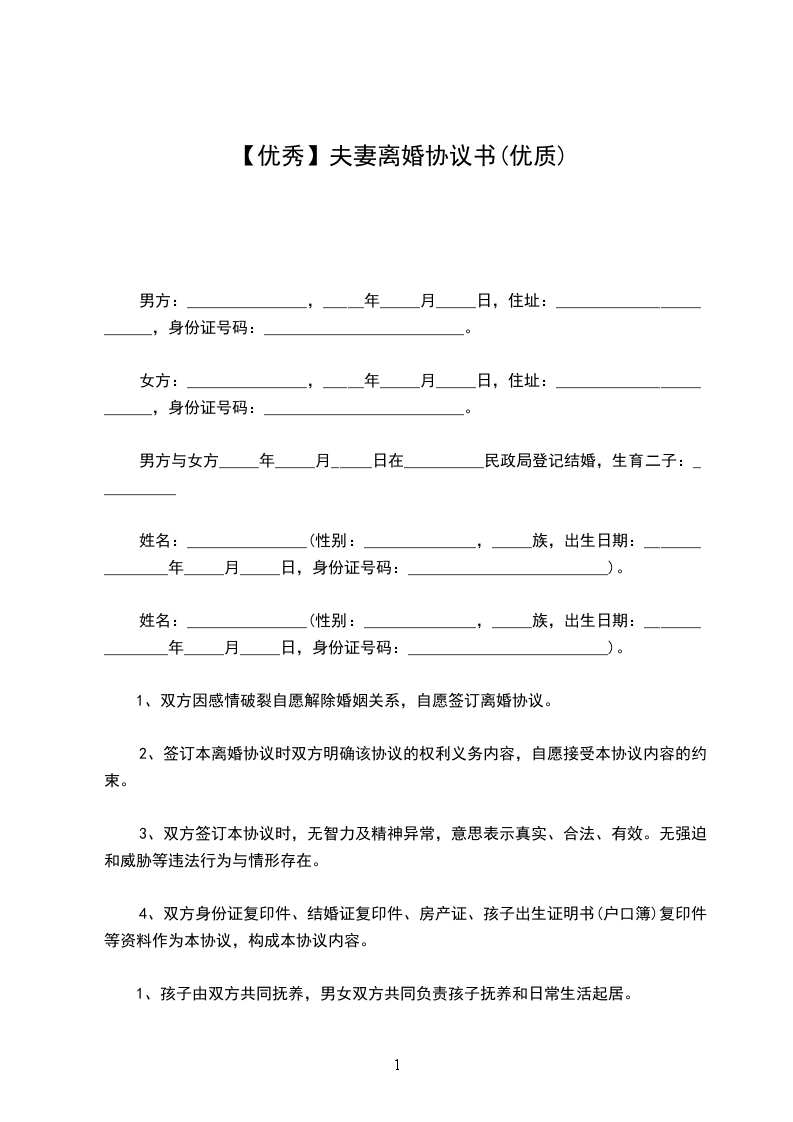 男方与女方_______年_____月认识,________年_____月_____日在_______登记结婚,婚后_____年_____月_____日生育一儿子(女儿),名_________。双方感情完全破裂,没有和好可能,现经夫妻双方自愿协商达成一致意见,订立离婚协议如下: