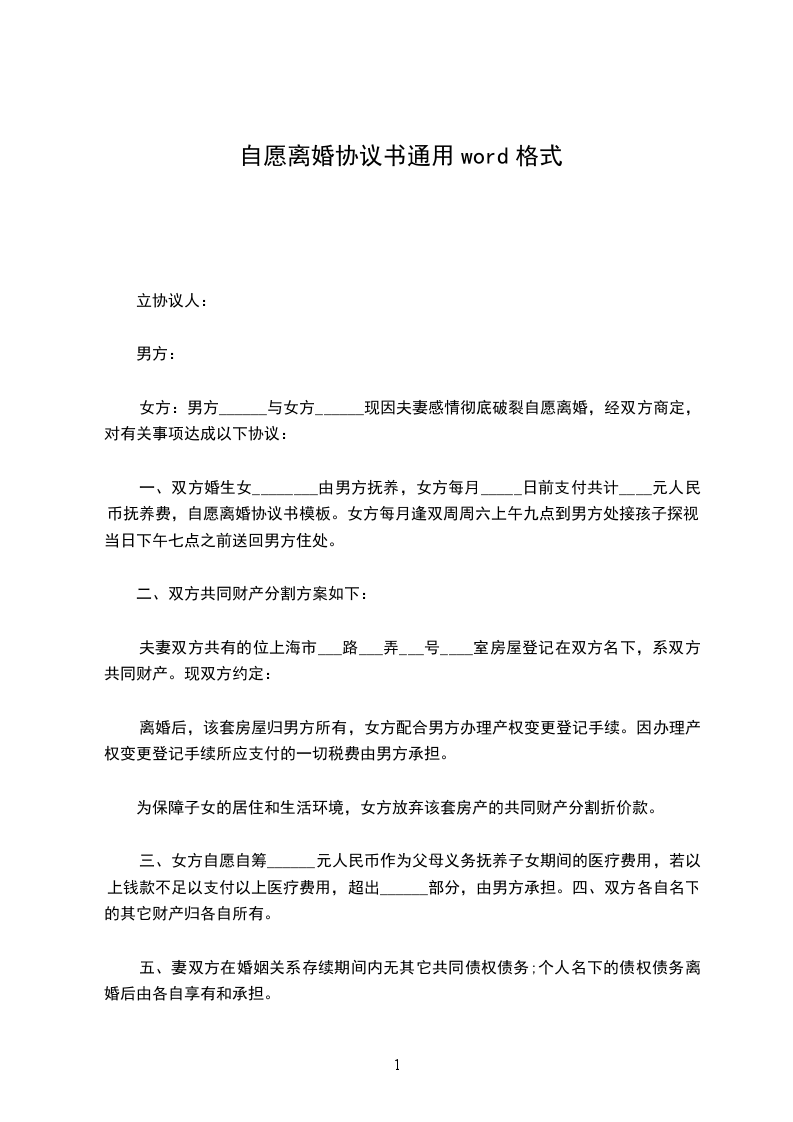 女方:男方______与女方______现因夫妻感情彻底破裂自愿离婚,经双方商定,对有关事项达成以下协议: