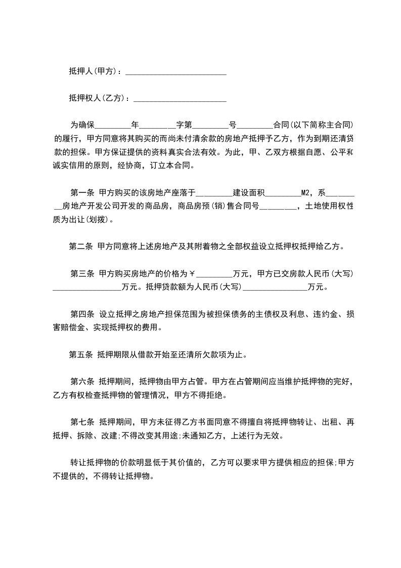 为确保_________年_________字第_________号_________合同(以下简称主合同)的履行,甲方同意将其购买的而尚未付清余款的房地产抵押予乙方,作为到期还清贷款的担保。甲方保证提供的资料真实合法有效。为此,甲、乙双方根据自愿、公平和诚实信用的原则,经协商,订立本合同。