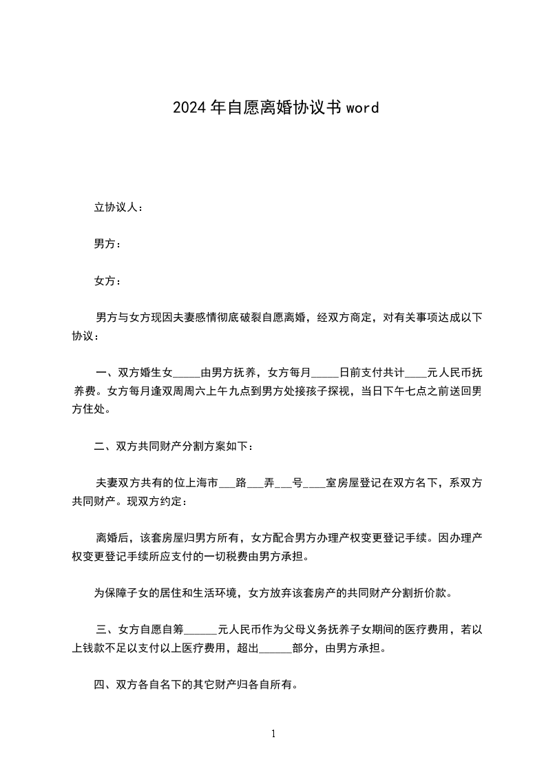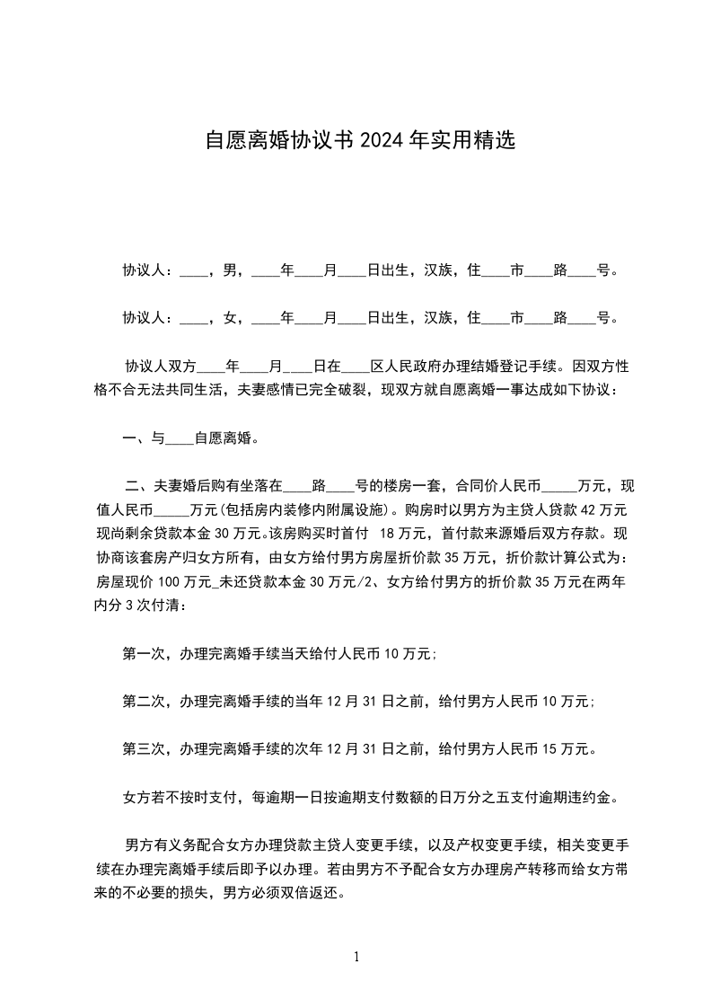 2.本协议一式_________份,男、女双方各执_________份,婚姻登记机关存档_________份,自双方签字,并经婚姻登记机关颁发《离婚证》之日起生效。